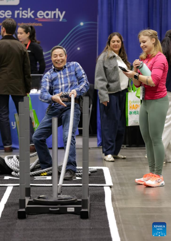 A man participates in a physical test at the 2026 Wellness Show at the Vancouver Convention Centre in Vancouver, British Columbia, Canada, on Jan. 31, 2026. The two-day event kicked off here on Saturday, with exhibitors showcasing their latest products and ideas in nutrition and fitness, as well as promoting physical and mental health. (Photo by Liang Sen/Xinhua)