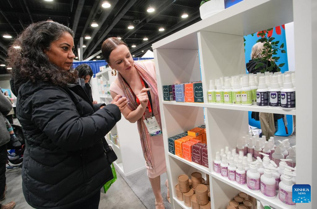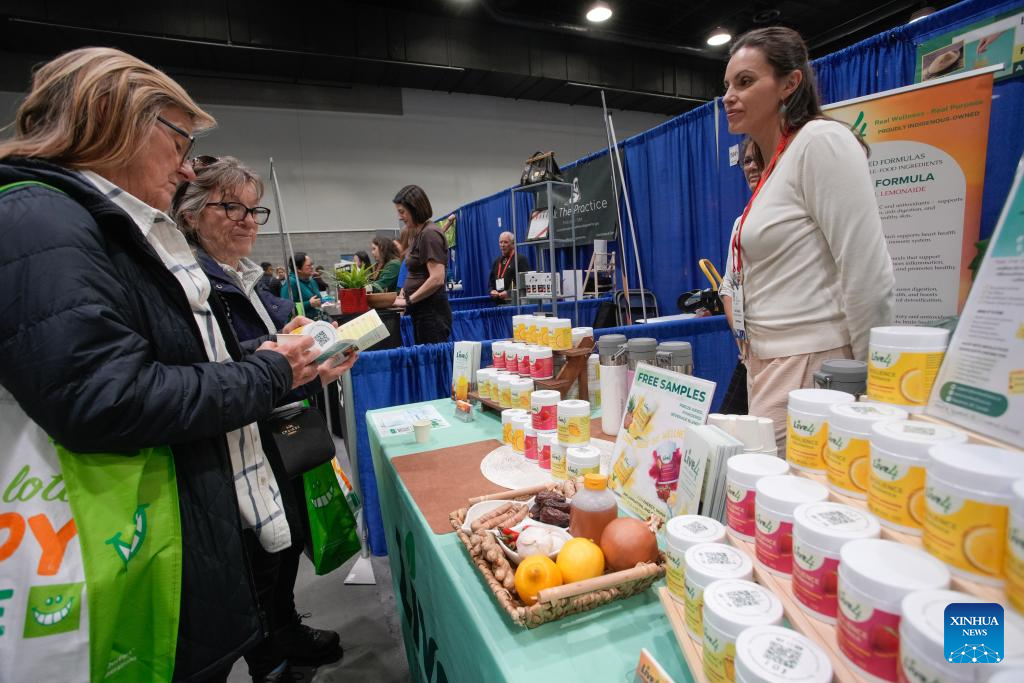 People view health food products at a booth during the 2026 Wellness Show at the Vancouver Convention Centre in Vancouver, British Columbia, Canada, on Jan. 31, 2026. The two-day event kicked off here on Saturday, with exhibitors showcasing their latest products and ideas in nutrition and fitness, as well as promoting physical and mental health. (Photo by Liang Sen/Xinhua)