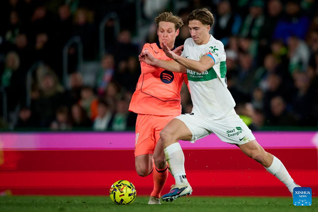 Frenkie de Jong (L) of Barcelona vies for the ball with David Affengruber of Elche during the La Liga football match between Elche and Barcelona in Elche, Spain, Jan. 31, 2026. (Stringer/Xinhua)