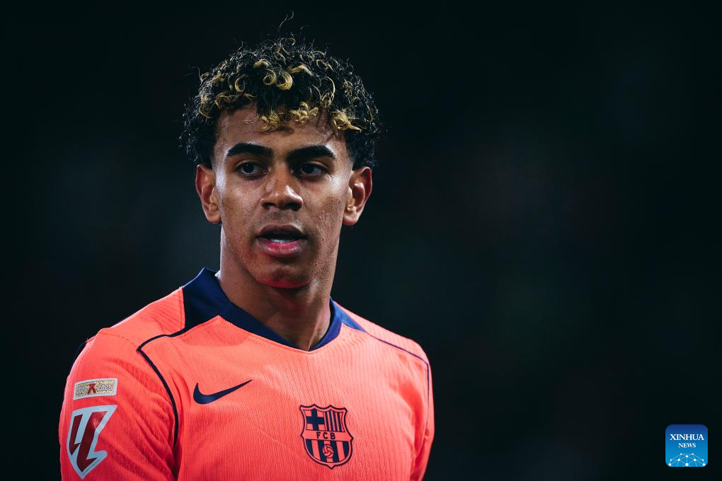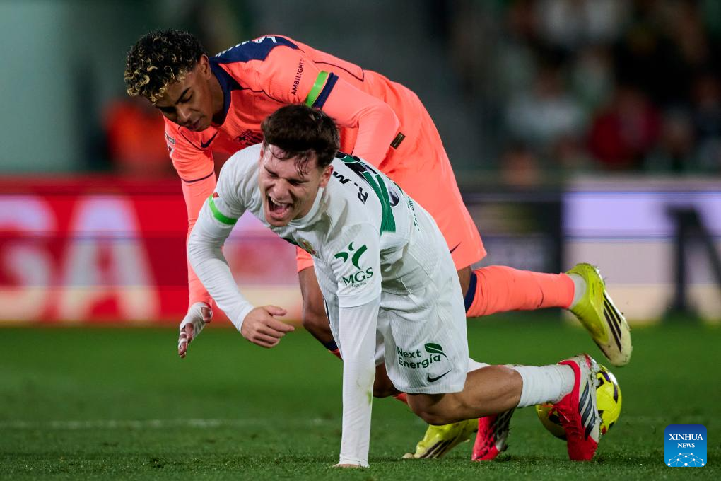 Lamine Yamal of Barcelona reacts during the La Liga football match between Elche and Barcelona in Elche, Spain, Jan. 31, 2026. (Stringer/Xinhua)
