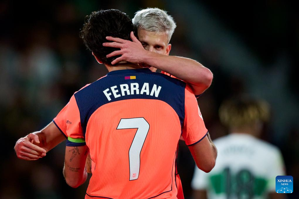 Ferran (L) of Barcelona celebrates a goal with his teammate during the La Liga football match between Elche and Barcelona in Elche, Spain, Jan. 31, 2026. (Stringer/Xinhua)