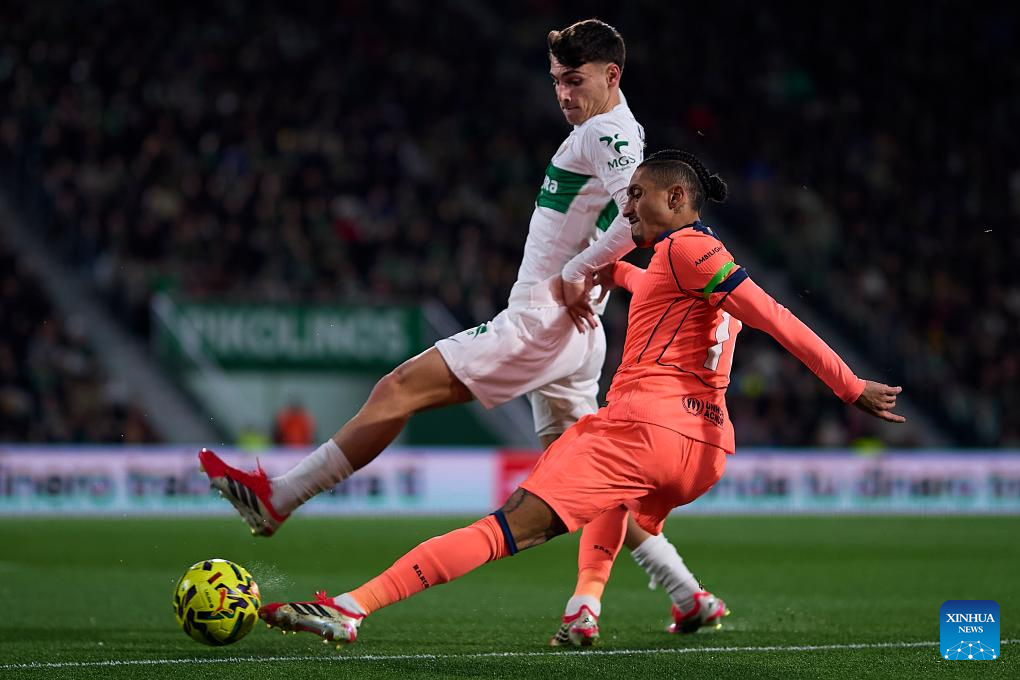 Raphinha (R) of Barcelona vies for the ball with Rodrigo Mendoza of Elche during the La Liga football match between Elche and Barcelona in Elche, Spain, Jan. 31, 2026. (Stringer/Xinhua)