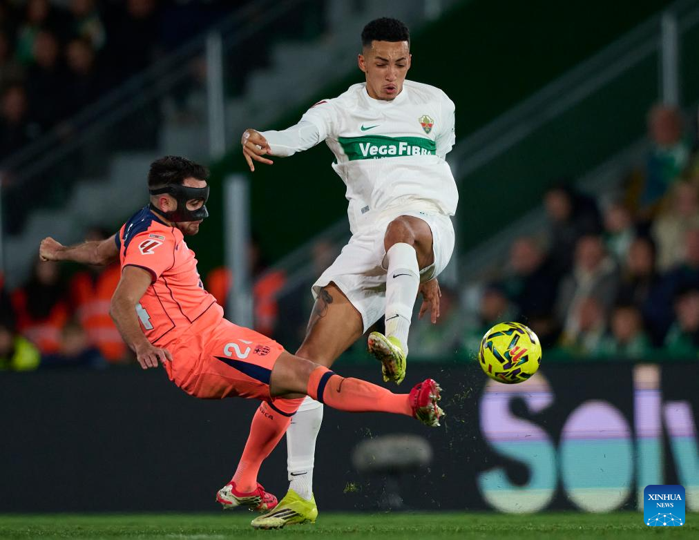 Eric Garcia (L) of Barcelona vies for the ball with Alvaro Rodriguez of Elche during the La Liga football match between Elche and Barcelona in Elche, Spain, Jan. 31, 2026. (Stringer/Xinhua)