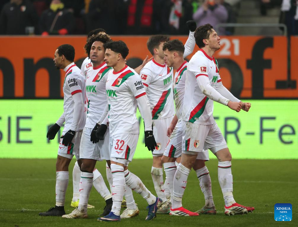 Players of FC Augsburg celebrate scoring during the German first division Bundesliga football match between FC Augsburg and FC St. Pauli in Augsburg, Germany, Jan. 31, 2026. (Photo by Philippe Ruiz/Xinhua)
