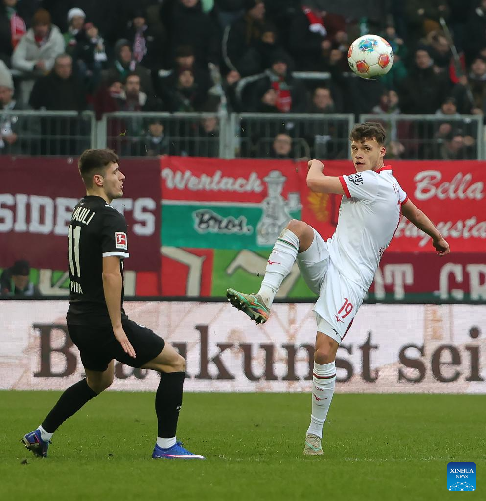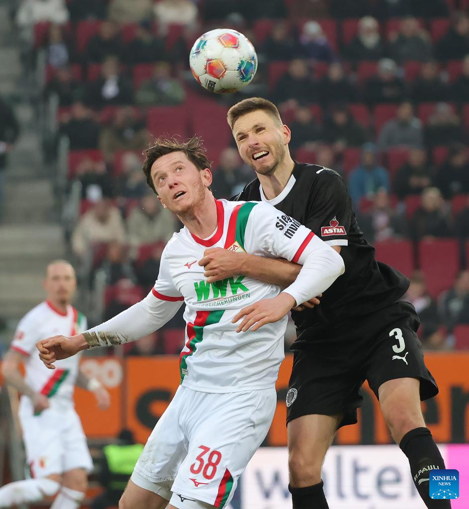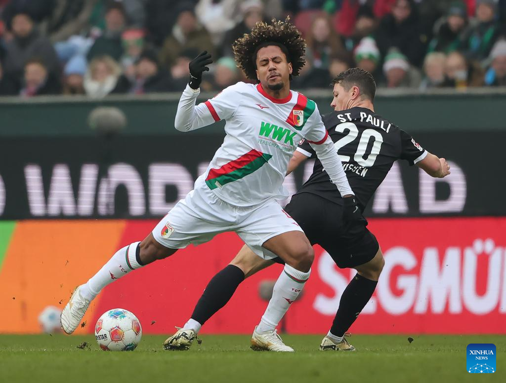 Robin Fellhauer (R) of FC Augsburg vies with Arkadiusz Pyrka of FC St. Pauli during the German first division Bundesliga football match between FC Augsburg and FC St. Pauli in Augsburg, Germany, Jan. 31, 2026. (Photo by Philippe Ruiz/Xinhua)