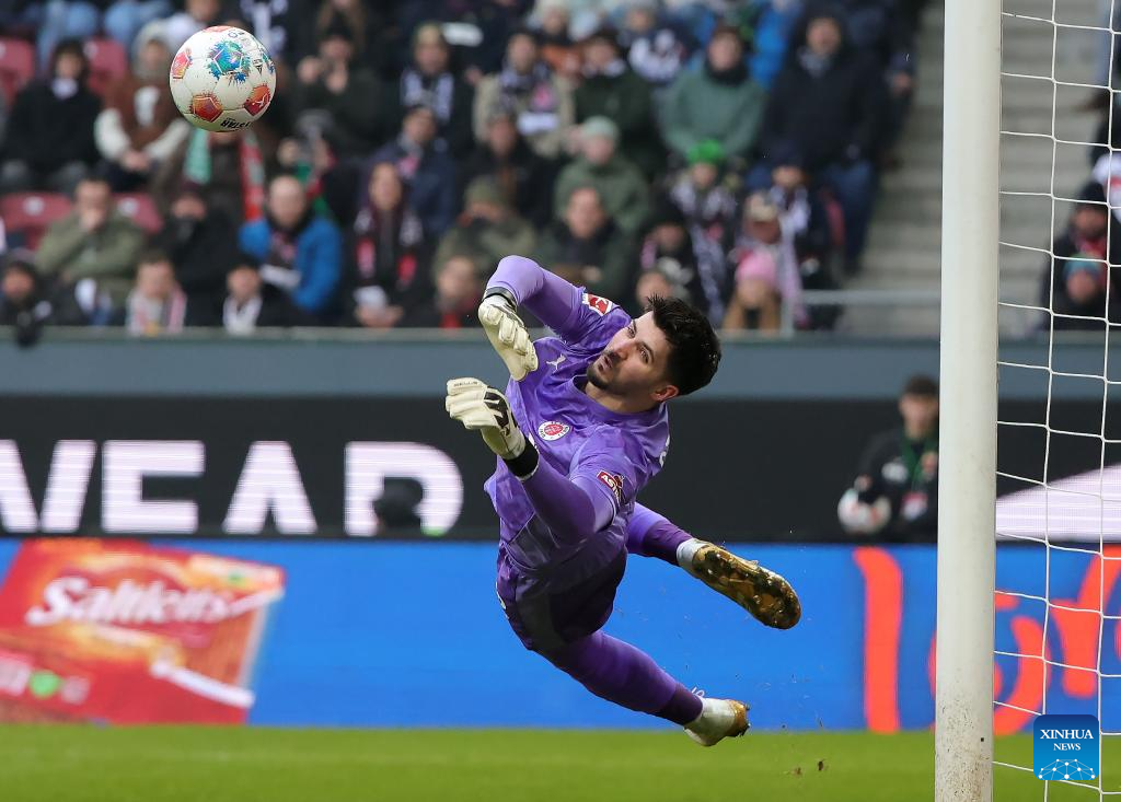 Goalkeeper of FC St. Pauli Nikola Vasilj makes a save during the German first division Bundesliga football match between FC Augsburg and FC St. Pauli in Augsburg, Germany, Jan. 31, 2026. (Photo by Philippe Ruiz/Xinhua)