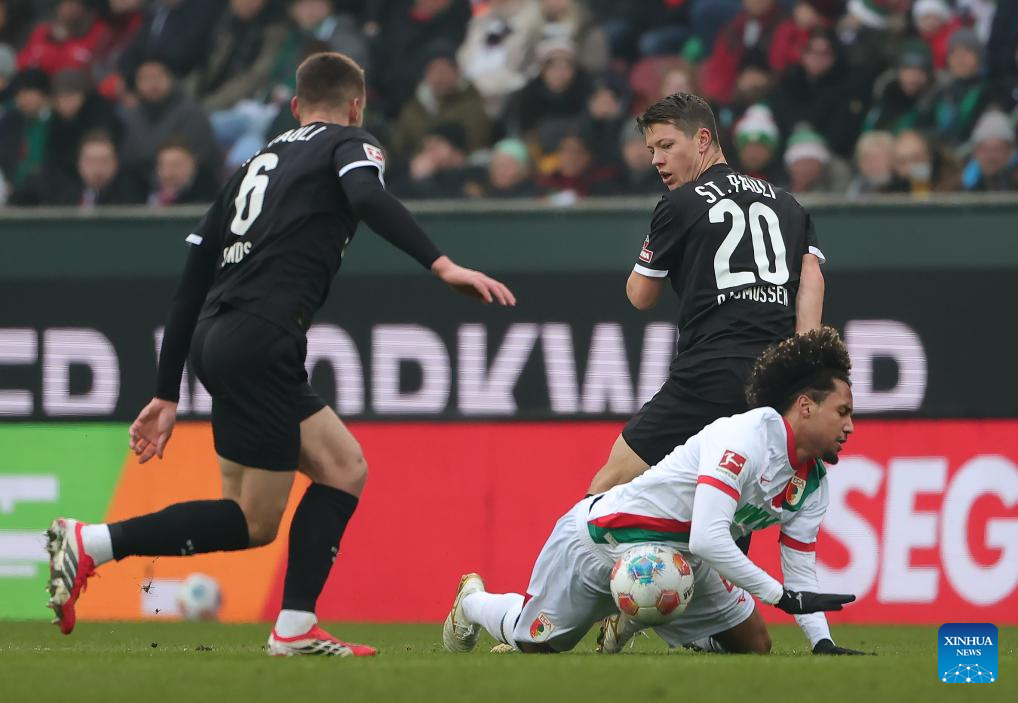 Han-Noah Massengo (bottom) of FC Augsburg vies with Mathias Rasmussen (R, top) and James Sands of FC St. Pauli during the German first division Bundesliga football match between FC Augsburg and FC St. Pauli in Augsburg, Germany, Jan. 31, 2026. (Photo by Philippe Ruiz/Xinhua)