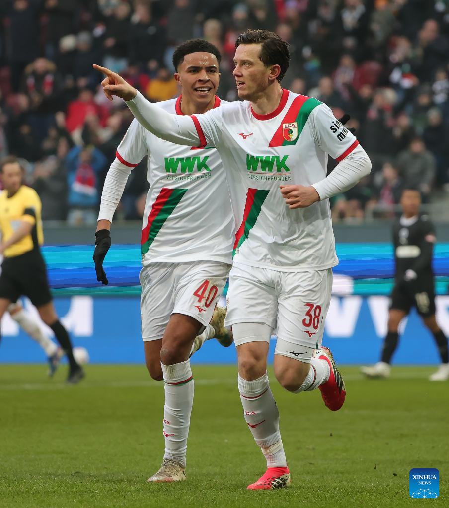 Michael Gregoritsch (R) of FC Augsburg celebrates scoring with his teammate during the German first division Bundesliga football match between FC Augsburg and FC St. Pauli in Augsburg, Germany, Jan. 31, 2026. (Photo by Philippe Ruiz/Xinhua)