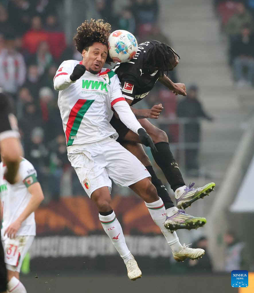Han-Noah Massengo (L) of FC Augsburg and Ricky-Jade Jones of FC St. Pauli head for the ball during the German first division Bundesliga football match between FC Augsburg and FC St. Pauli in Augsburg, Germany, Jan. 31, 2026. (Photo by Philippe Ruiz/Xinhua)
