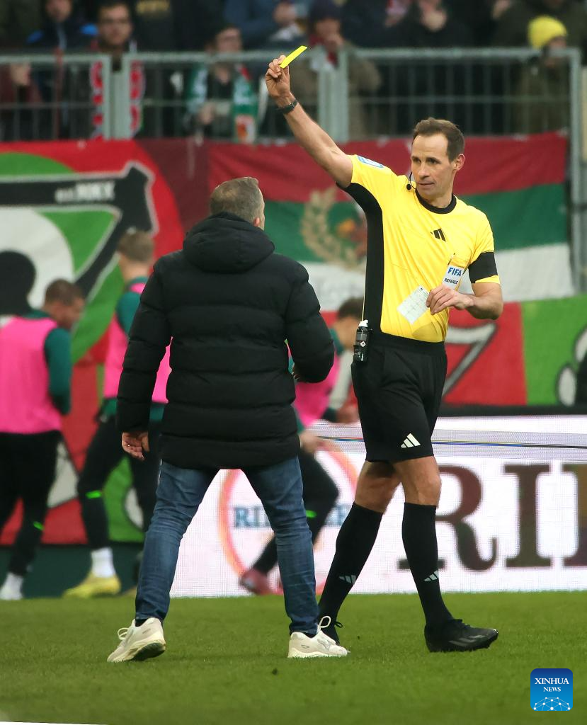 Head coach of FC Augsburg Manuel Baum (L) receives a yellow card during the German first division Bundesliga football match between FC Augsburg and FC St. Pauli in Augsburg, Germany, Jan. 31, 2026. (Photo by Philippe Ruiz/Xinhua)