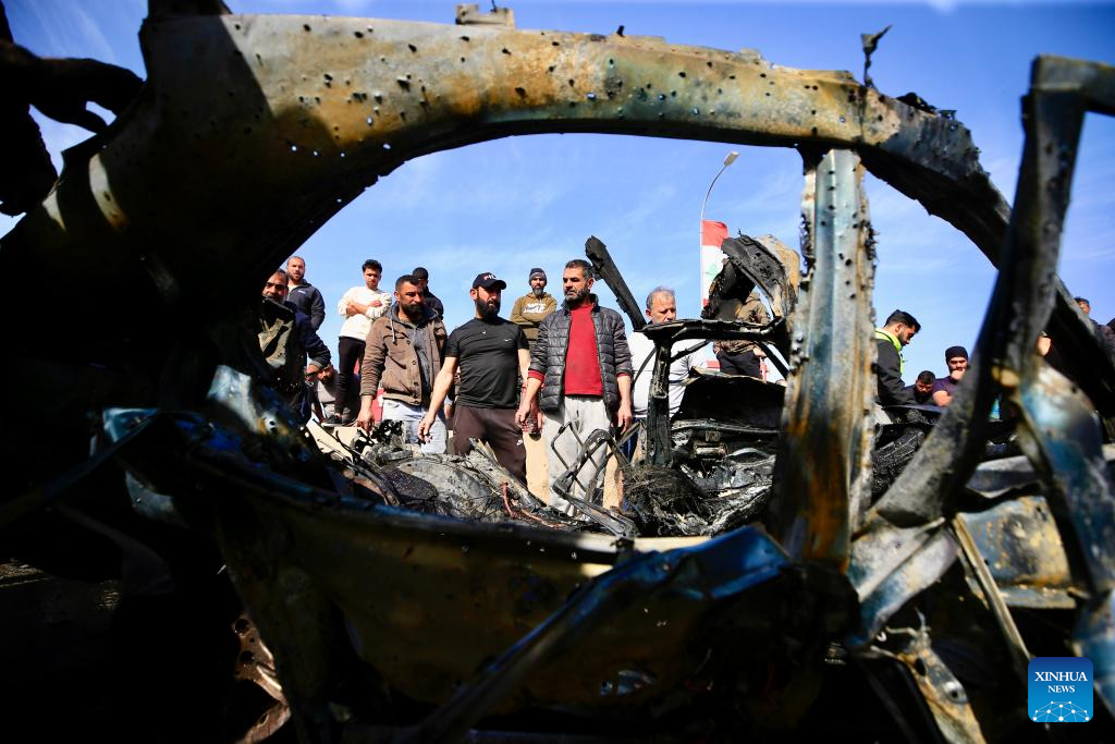People are seen around the wreckage of a car targeted by an Israeli drone in Ansariyah, southern Lebanon, Feb. 2, 2026. One person was killed and eight others were injured on Monday in two Israeli airstrikes on southern Lebanon, the Lebanese health ministry reported.