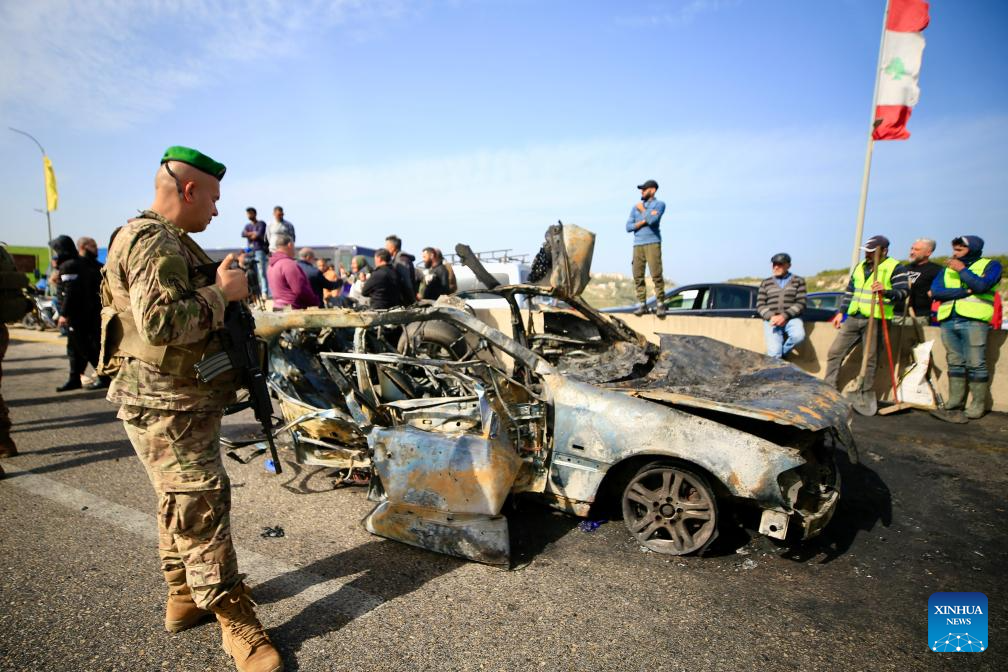 According to the ministry, one person was killed and four others were injured in an Israeli airstrike on a vehicle in Ansariyah area, whereas four more were injured in an Israeli airstrike on a car in the Tyre district. (Photo by Ali Hashisho/Xinhua)
