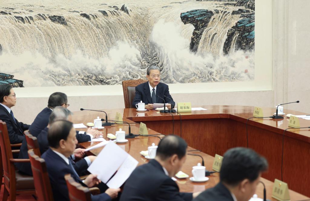 Zhao Leji, chairman of the National People's Congress (NPC) Standing Committee, presides over the 59th meeting of the Council of Chairpersons of the 14th NPC Standing Committee at the Great Hall of the People in Beijing, capital of China, Feb. 2, 2026. (Xinhua/Ding Lin)