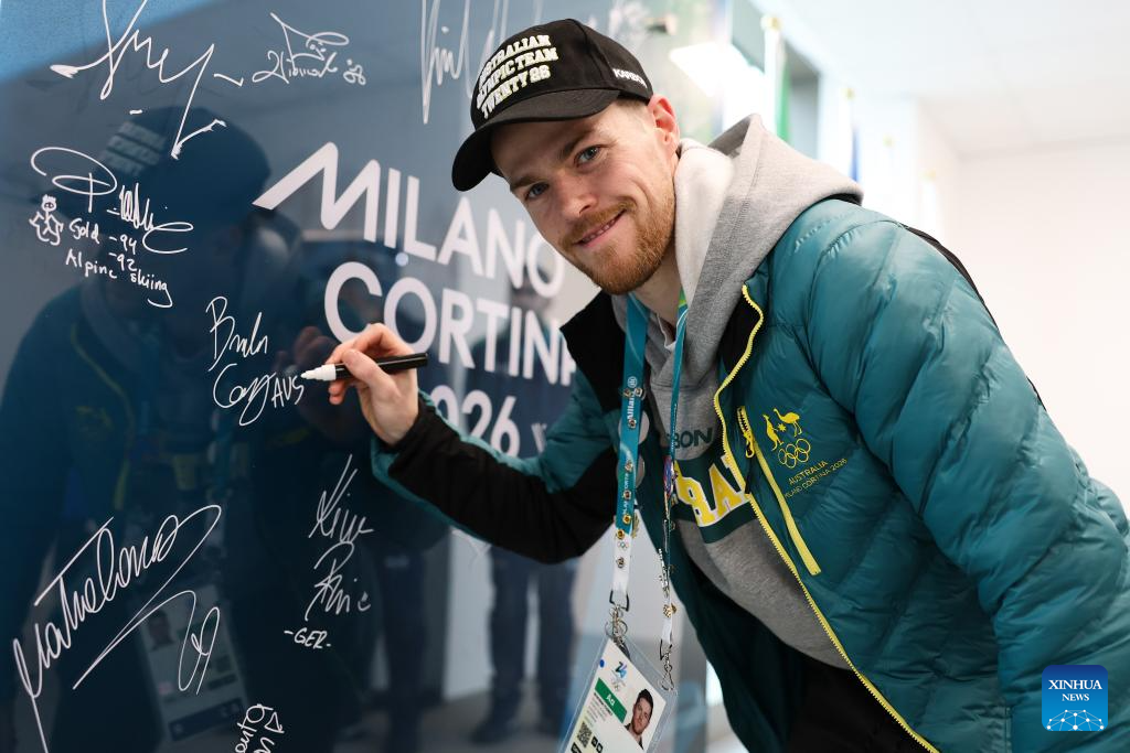 Athletes sign their autographs during the Inauguration of the Olympic Truce Mural with the IOC EB and the IOC Athletes' Commission (AC) at the Olympic Village in Milan, Italy, Feb. 2, 2026. (Andreas Rentz/Pool via Xinhua)