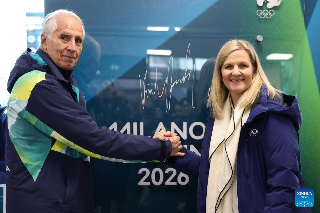 Kirsty Coventry (L), President of the IOC, greets athletes during the Inauguration of the Olympic Truce Mural with the IOC EB and the IOC Athletes' Commission (AC) at the Olympic Village in Milan, Italy, Feb. 2, 2026. (Andreas Rentz/Pool via Xinhua)
