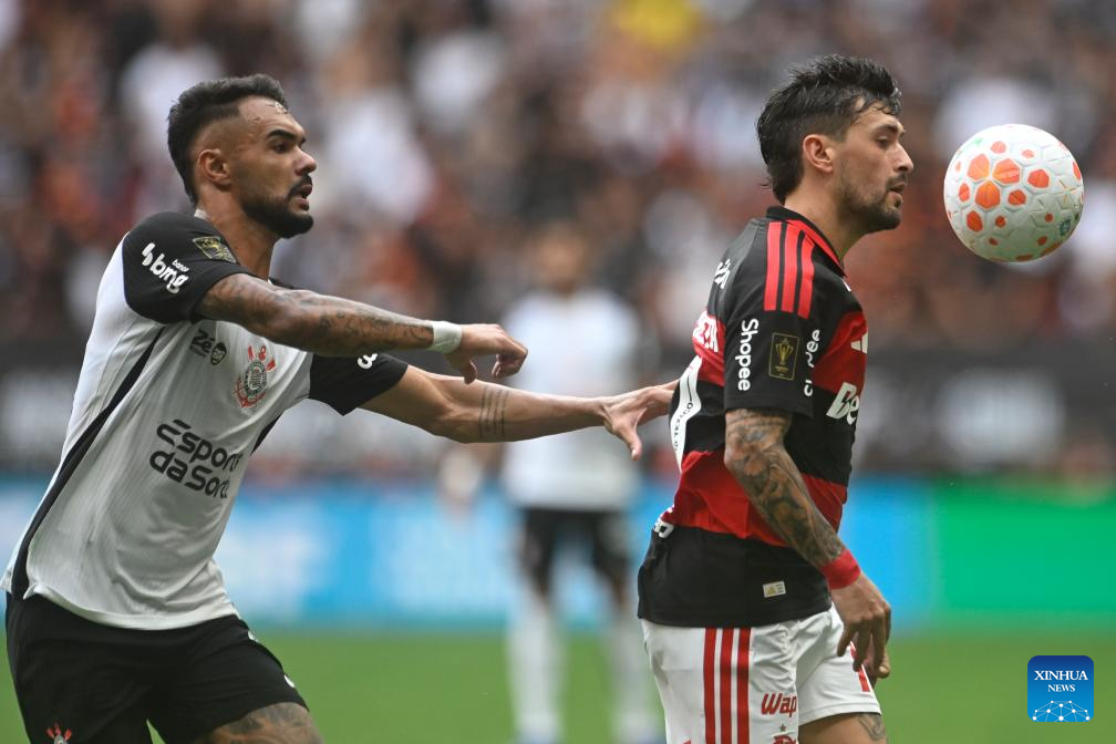 Matheus Bidu (L) of Corinthians challenges Giorgian de Arrascaeta of Flamengo for the ball during the 2026 Supercopa do Brasil final match between Corinthians and Flamengo in Brasilia, Brazil, Feb. 1, 2026. (Photo by Lucio Tavora/Xinhua)
