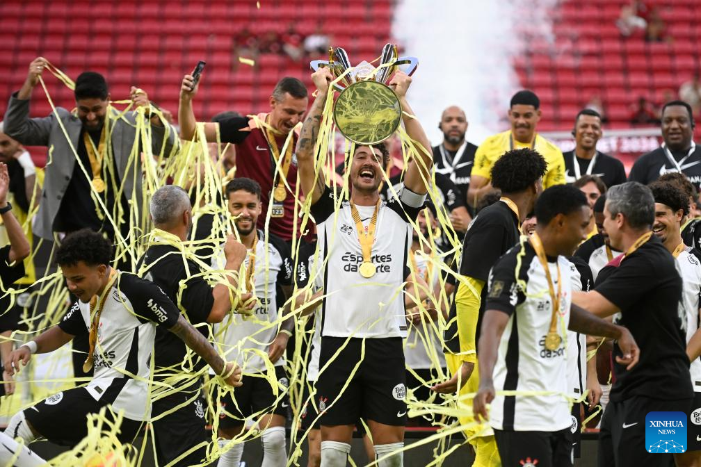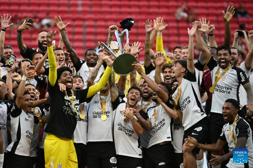 Corinthians' players celebrate after winning the 2026 Supercopa do Brasil final match between Corinthians and Flamengo in Brasilia, Brazil, Feb. 1, 2026. (Photo by Lucio Tavora/Xinhua)