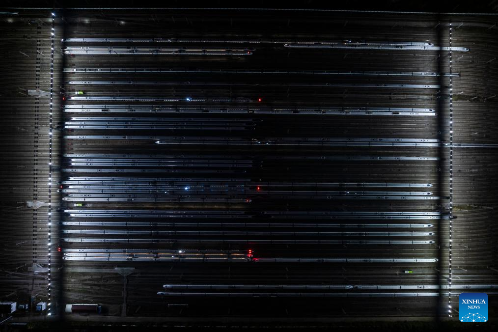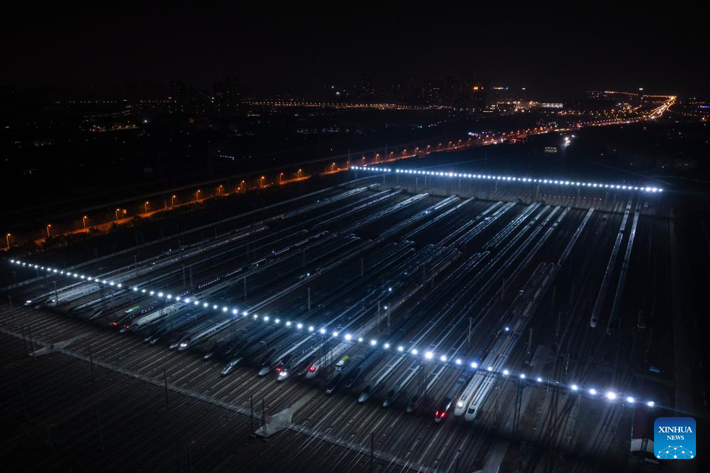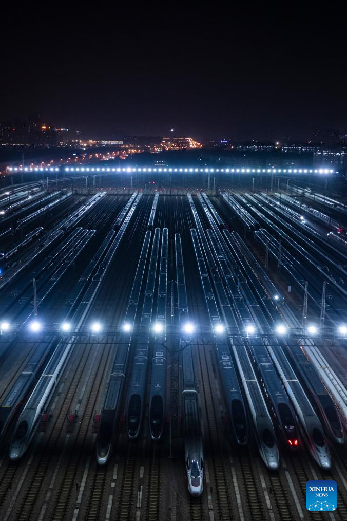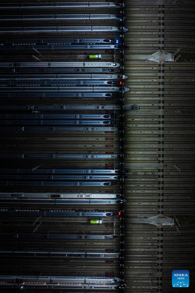 An aerial drone photo taken on Feb. 1, 2026 shows high-speed trains at a train depot in Wuhan, central China's Hubei Province. (Xinhua/Wu Zhizun)