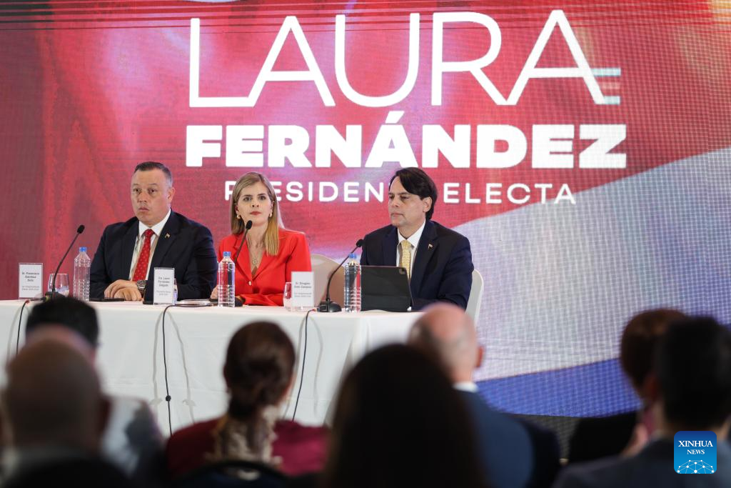Costa Rican President-elect Laura Fernandez (C) attends a press conference in San Jose, Costa Rica, Feb. 2, 2026. Laura Fernandez, the candidate from the ruling Sovereign People Party, on Sunday celebrated her victory in the Costa Rican presidential election after securing 48.3 percent of the vote. (Photo by Francisco Canedo/Xinhua)