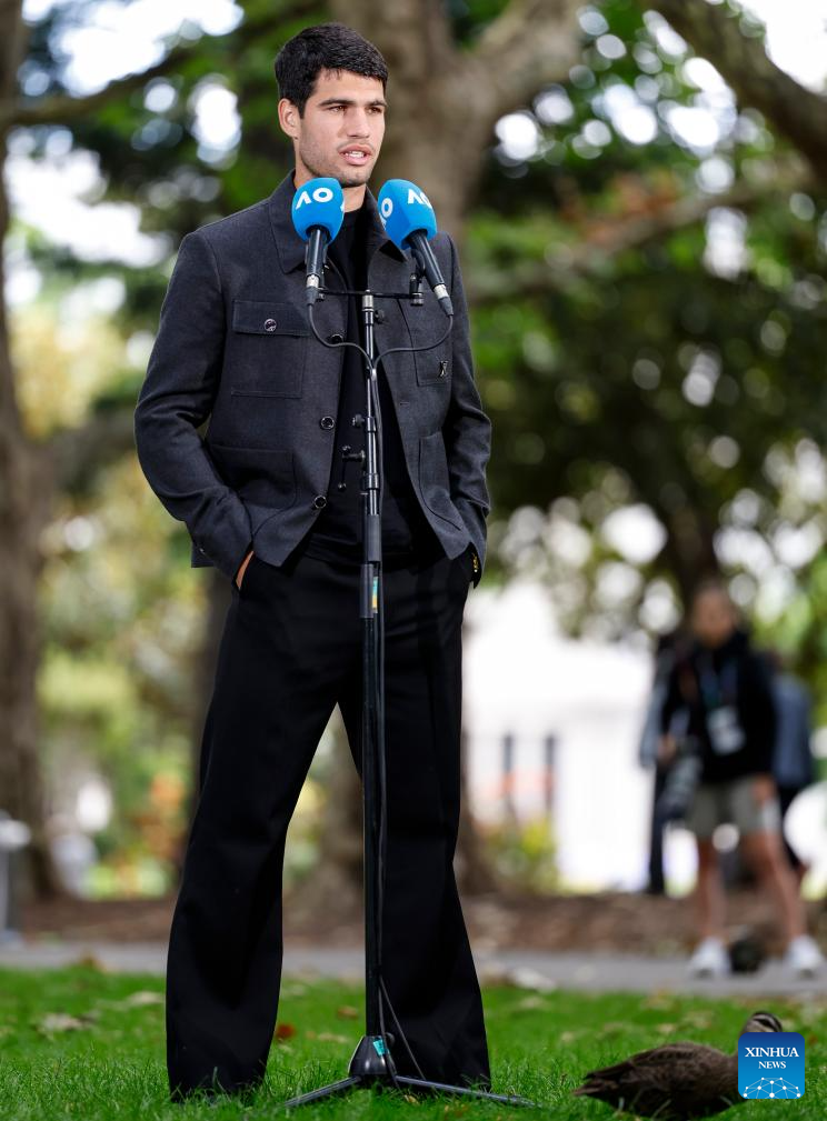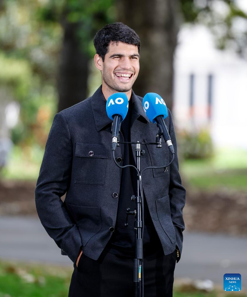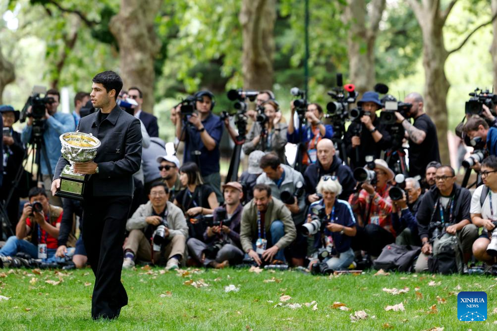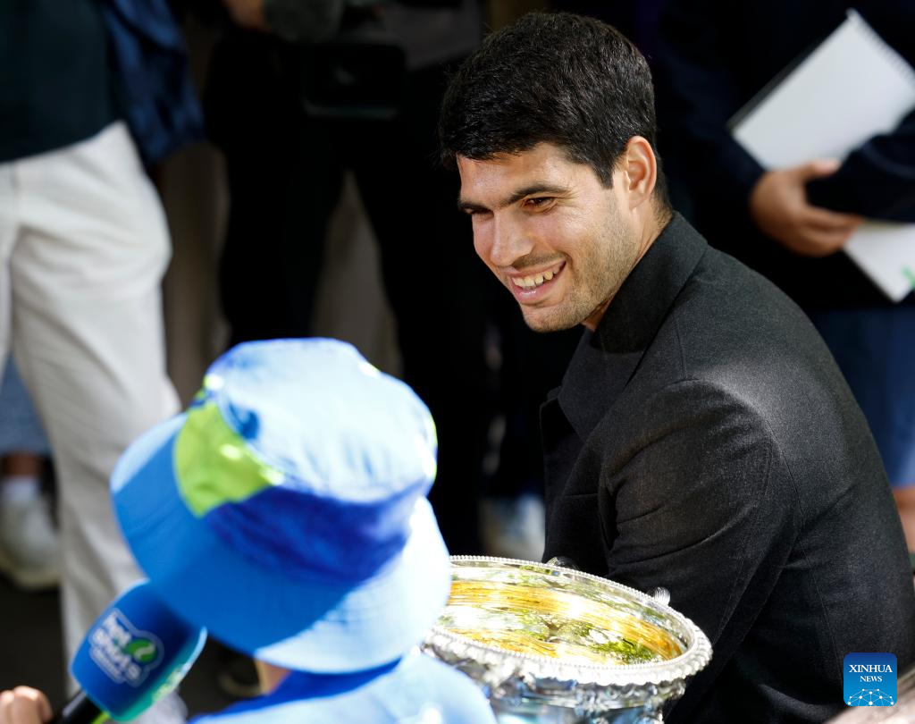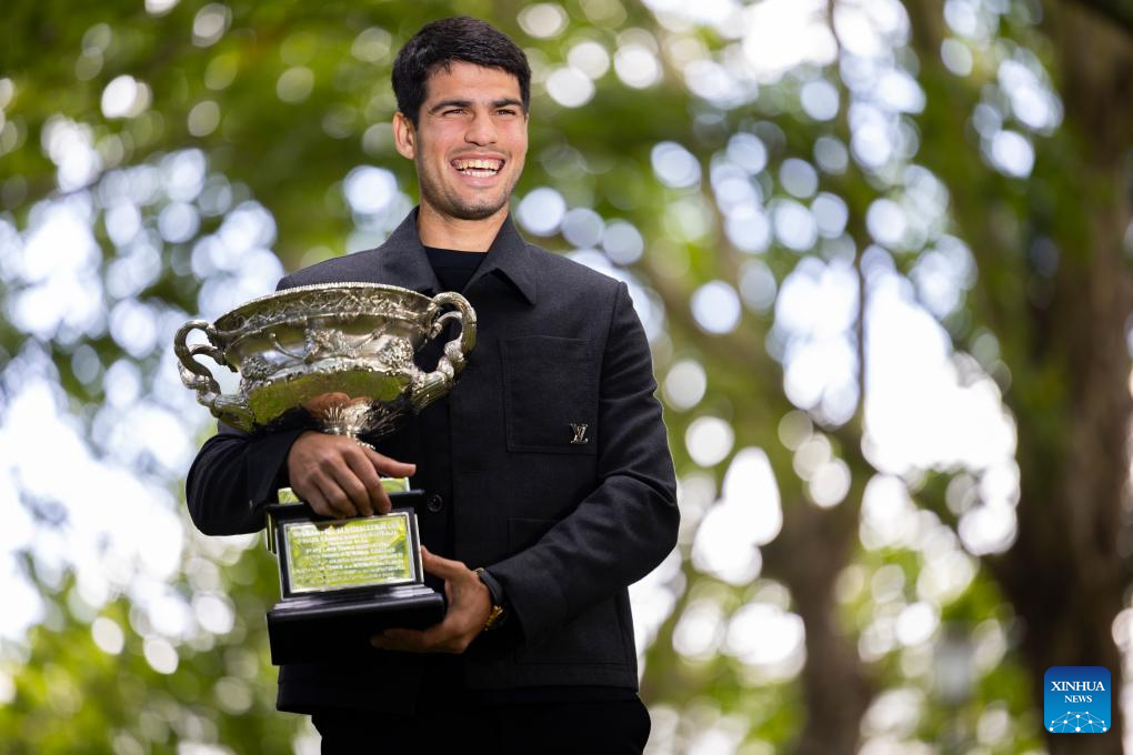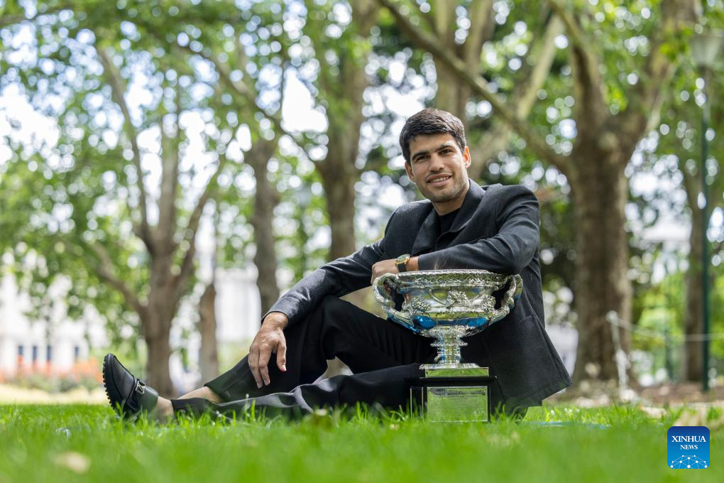 Carlos Alcaraz of Spain is interviewed by media after posing with the Norman Brookes Challenge Cup during the 2026 Australian Open men's champion media opportunity at the Royal Exhibition Building in Melbourne, Australia, Feb. 2, 2026. (Xinhua/Ma Ping)