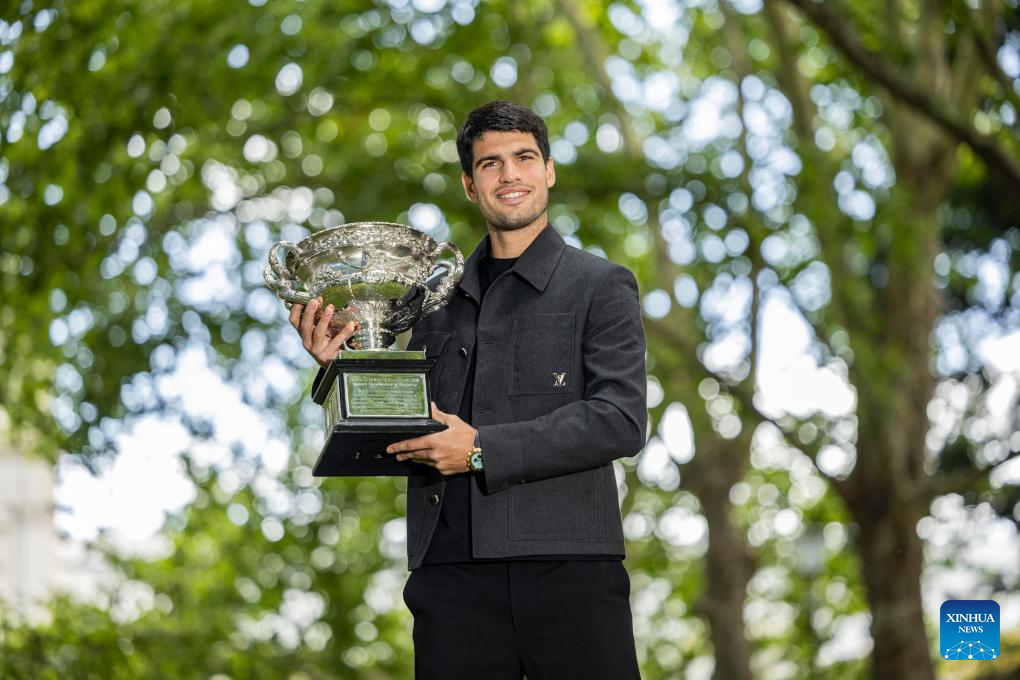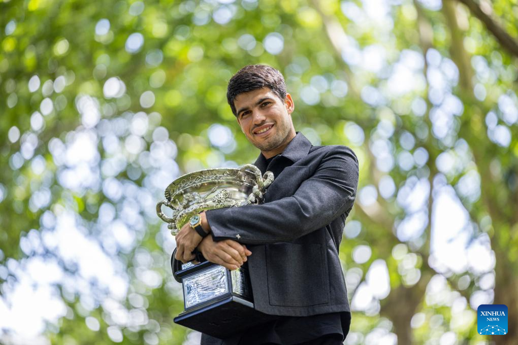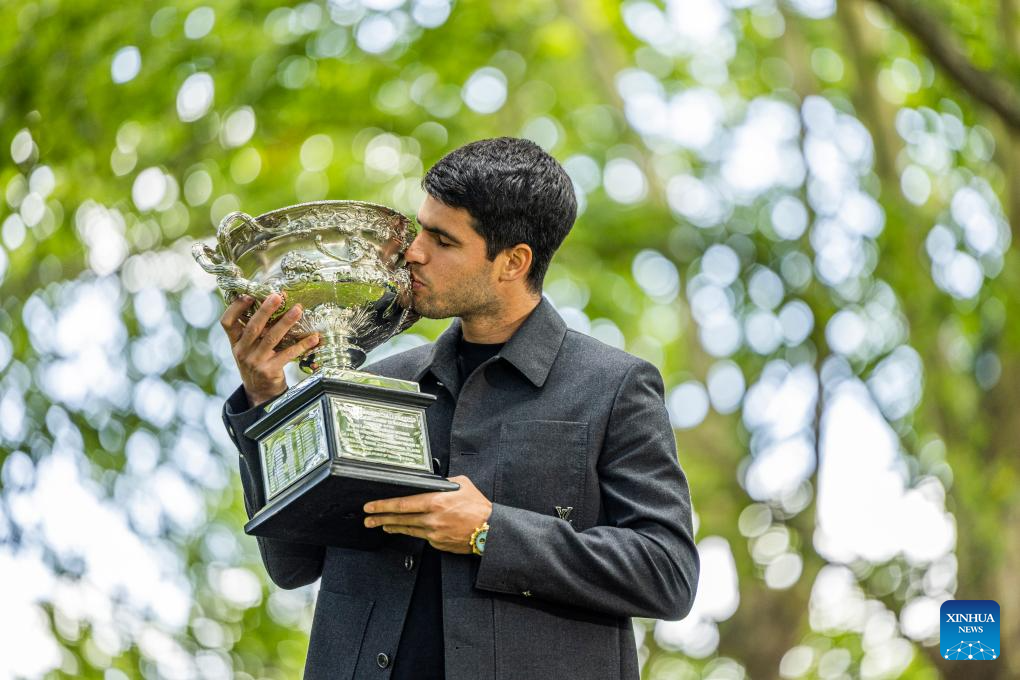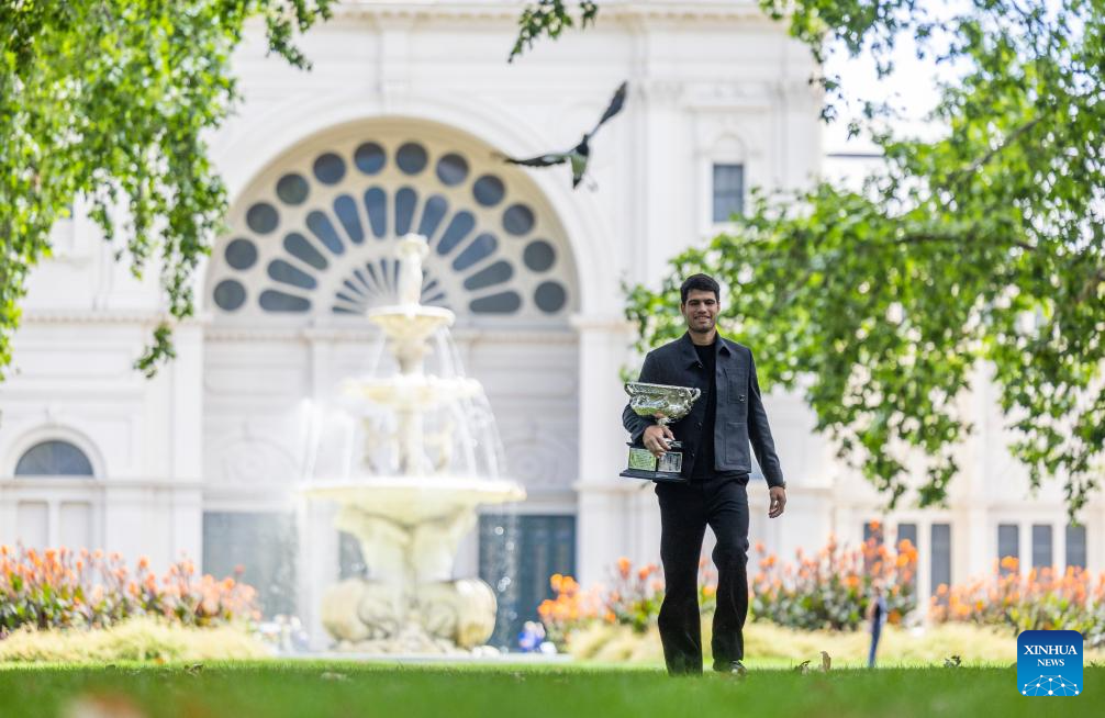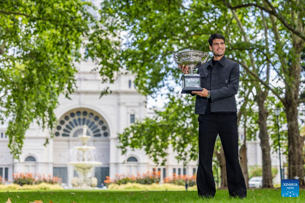Carlos Alcaraz of Spain poses with the Norman Brookes Challenge Cup during the 2026 Australian Open men's champion media opportunity at the Royal Exhibition Building in Melbourne, Australia, Feb. 2, 2026. (Xinhua/Ma Ping)