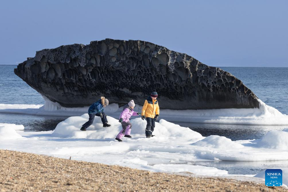 Children play on the Sun Beach in Vladivostok, Russia, Feb. 1, 2026. Sun Beach is famous for its unique rock formations, some of which resemble animals such as seal and toad. (Photo by Andrey Matveenko/Xinhua)