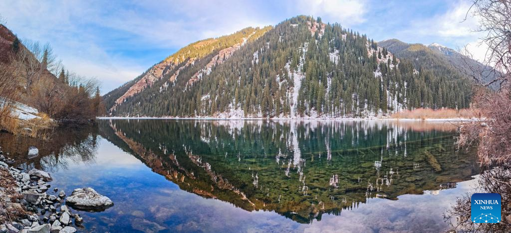 This stitched mobile phone panoramic photo taken on Jan. 31, 2026 shows a view of the Kolsai Lakes National Park in Almaty Region, Kazakhstan. (Xinhua/Li Renzi)