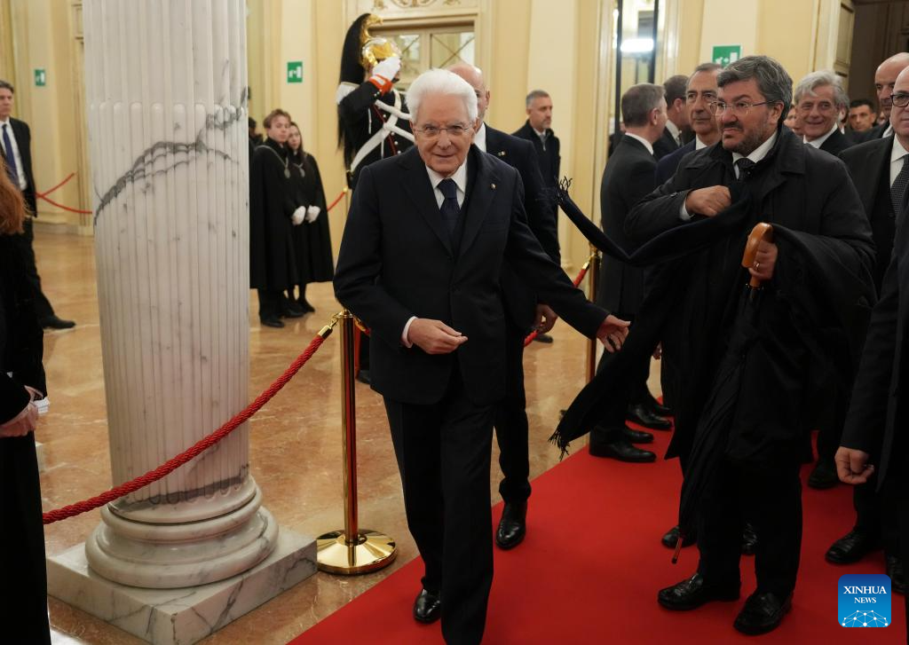 Italian President Sergio Mattarella (front L) arrives for the opening ceremony of the 145th IOC Session at La Scala Theatre in Milan, Italy on Feb. 2, 2026. (Xinhua/Sun Fei)