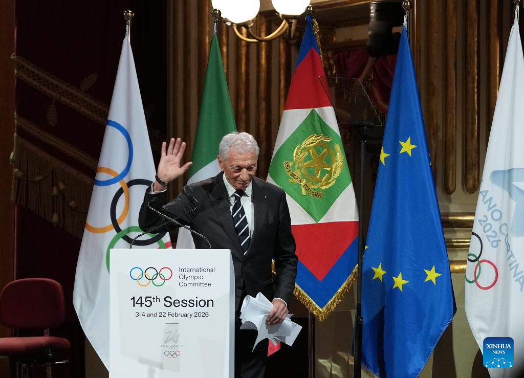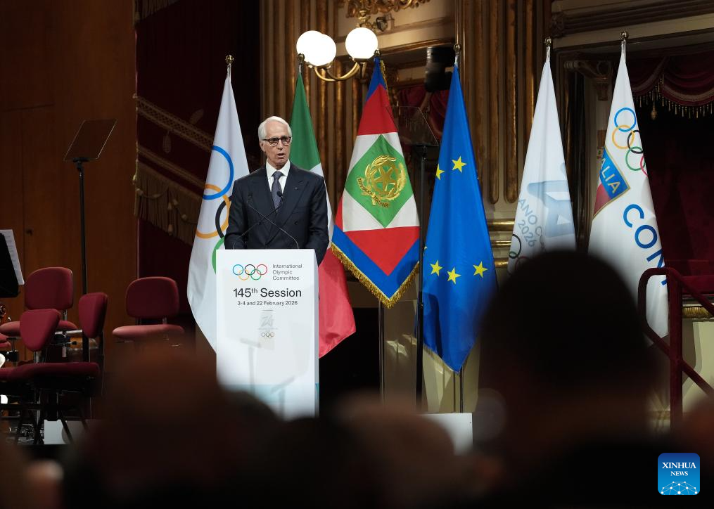 Giovanni Malago, President of the organizing committee for the 2026 Winter Olympics, delivers a speech during the opening ceremony of the 145th IOC Session at La Scala Theatre in Milan, Italy on Feb. 2, 2026. (Xinhua/Sun Fei)
