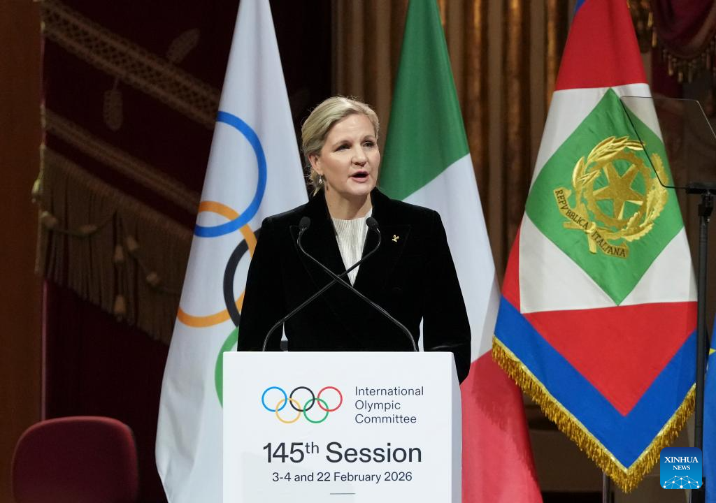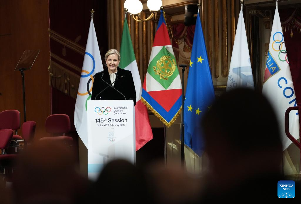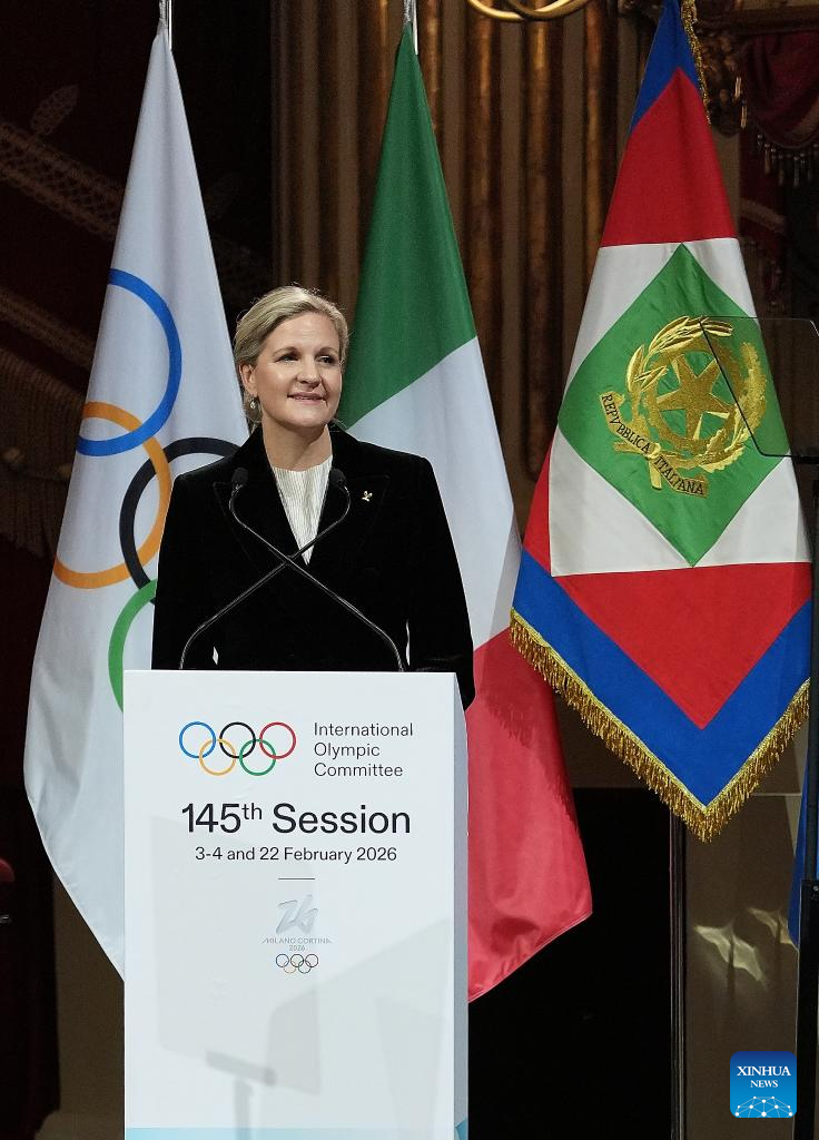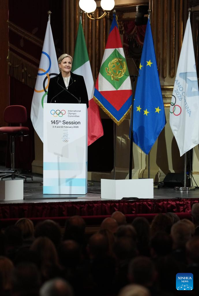 IOC President Kirsty Coventry delivers a speech during the opening ceremony of the 145th IOC Session at La Scala Theatre in Milan, Italy on Feb. 2, 2026. (Xinhua/Sun Fei)