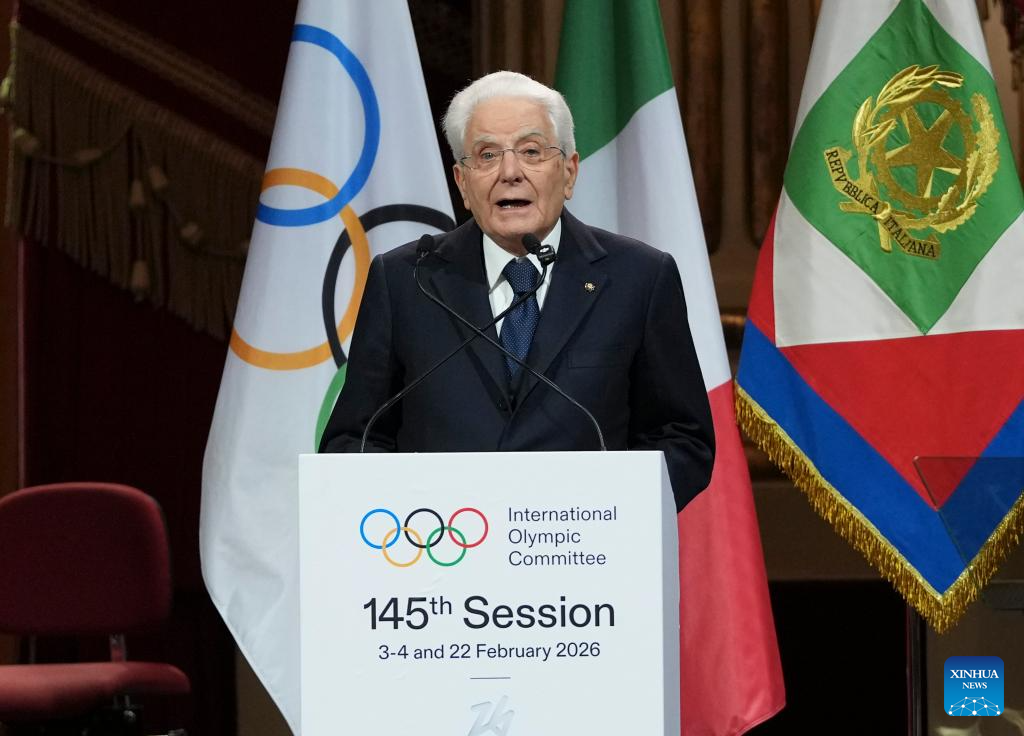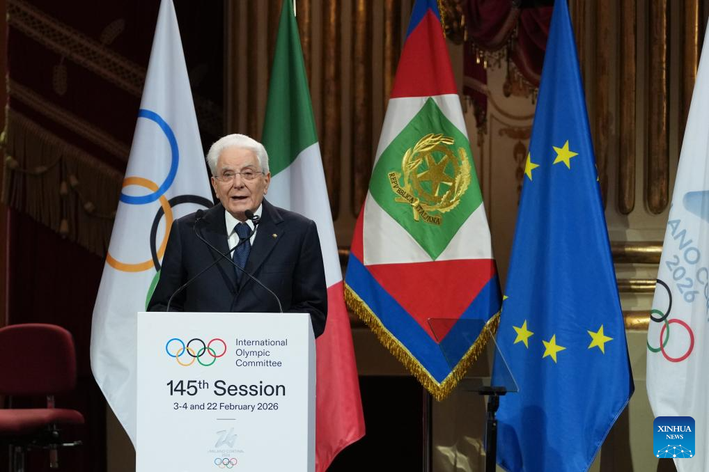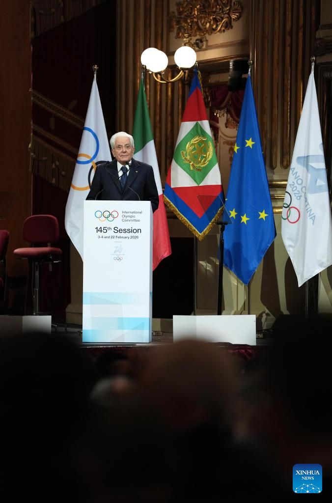 Italian President Sergio Mattarella delivers a speech during the opening ceremony of the 145th IOC Session at La Scala Theatre in Milan, Italy on Feb. 2, 2026. (Xinhua/Sun Fei)