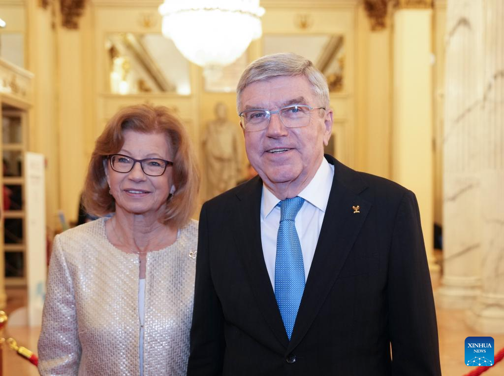 Former IOC president Thomas Bach (R) and his wife Claudia Bach arrive for the opening ceremony of the 145th IOC Session at La Scala Theatre in Milan, Italy on Feb. 2, 2026. (Xinhua/Sun Fei)