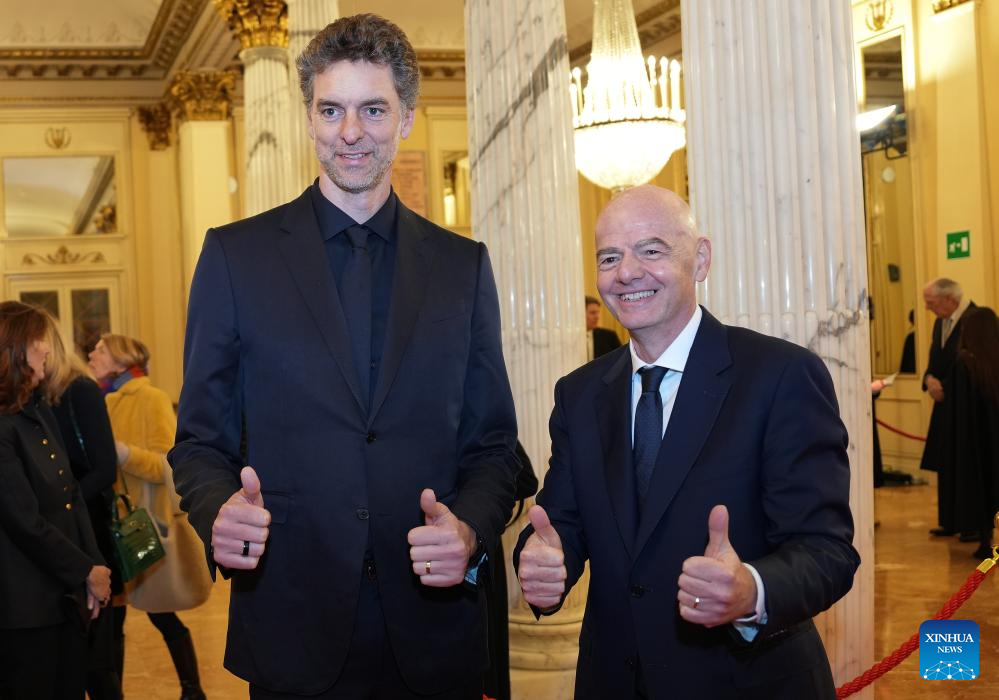 FIFA President Gianni Infantino (L) and IOC Athletes Commission member Pau Gasol Saez arrive for the opening ceremony of the 145th IOC Session at La Scala Theatre in Milan, Italy on Feb. 2, 2026. (Xinhua/Sun Fei)