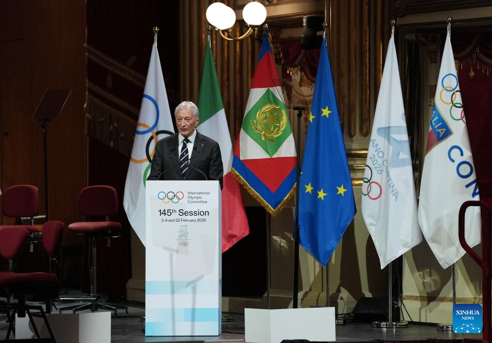 Luciano Buonfiglio, President of the Italian National Olympic Committee (CONI), delivers a speech during the opening ceremony of the 145th IOC Session at La Scala Theatre in Milan, Italy on Feb. 2, 2026. (Xinhua/Sun Fei)