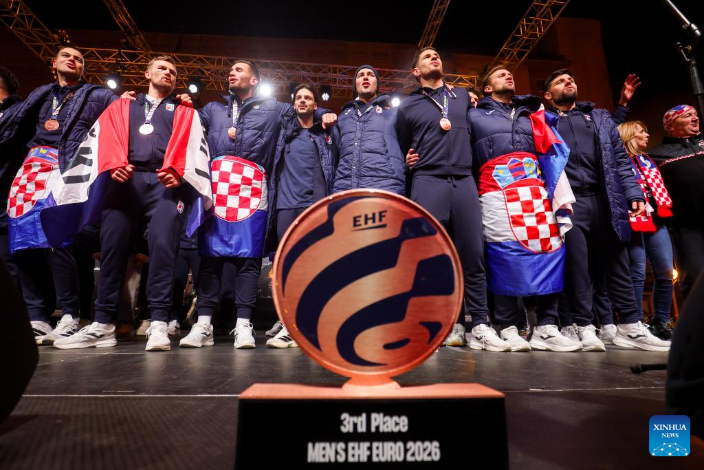 Croatia's handball team members are seen during the ceremonial welcome for the Croatian Handball Team players in Zagreb, Croatia on Feb. 2, 2026. Croatia won the bronze medal at the 2026 EHF European Men's Handball Championship. (Photo by Marko Lukunic/PIXSELL via Xinhua)