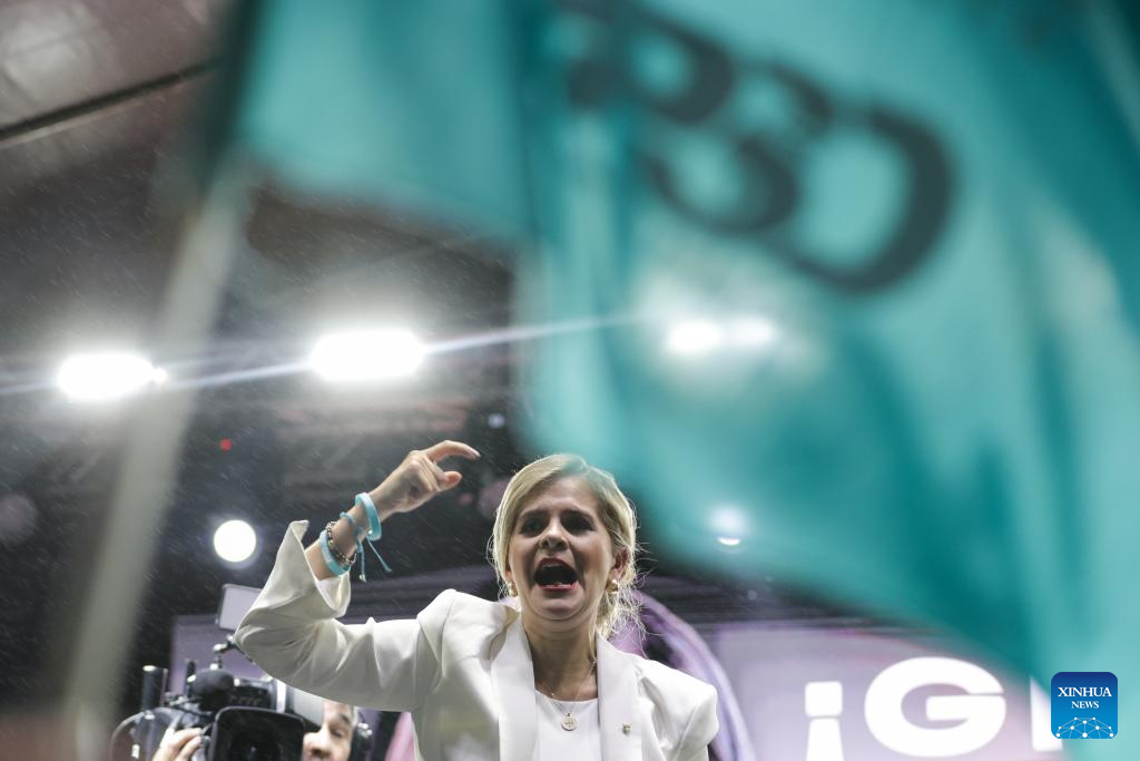 Laura Fernandez, the Sovereign People Party candidate, celebrated on Sunday her victory of Costa Rica's presidential election alongside supporters at a hotel in downtown San Jose. (Photo by Francisco Canedo/Xinhua)