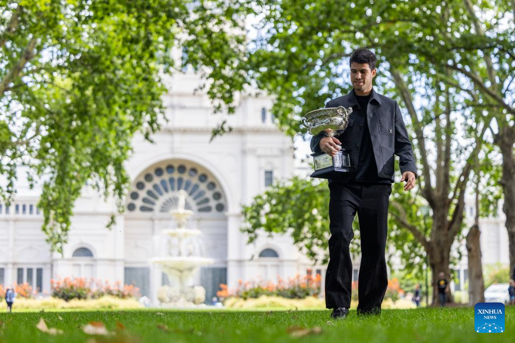 Carlos Alcaraz of Spain poses with the Norman Brookes Challenge Cup during the 2026 Australian Open men's champion media opportunity at the Royal Exhibition Building in Melbourne, Australia, Feb. 2, 2026. (Photo by Hu Jingchen/Xinhua)