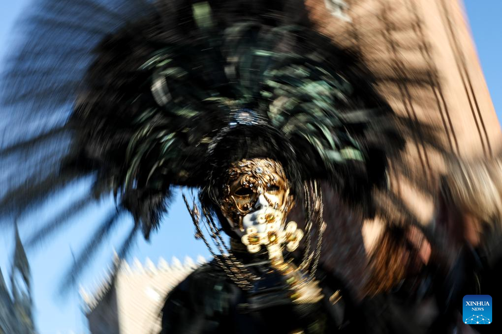 A reveler poses at the St. Mark's Square during the Venice Carnival 2026 in Venice, Italy, Feb. 1, 2026. (Xinhua/Li Jing)