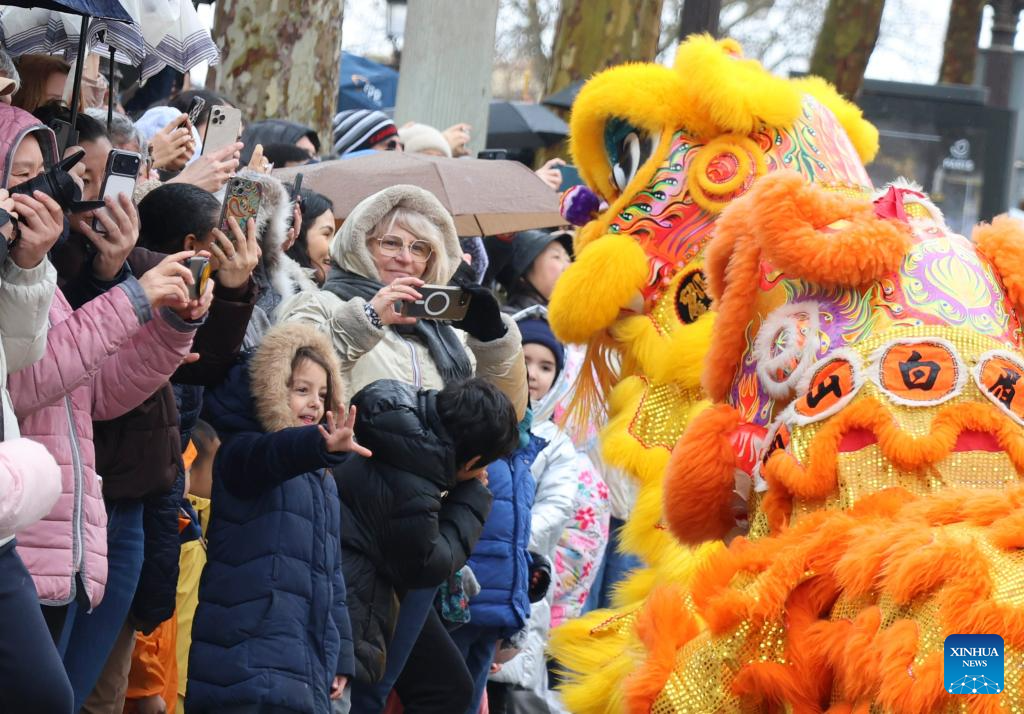 People watch a lion dance performance during a parade celebrating the upcoming Chinese New Year on the Champs-Elysees avenue in Paris, France, Feb. 1, 2026. (Xinhua/Zhang Baihui)