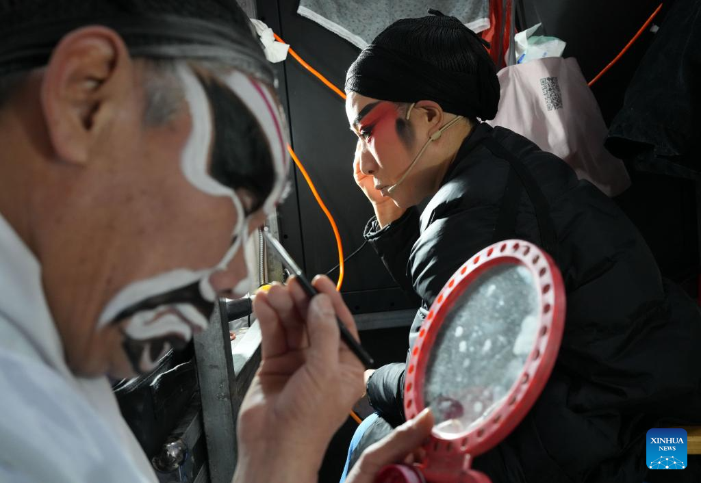 Artists warm up before a Wuju Opera show in Meixia Village, Jinyun County of Lishui City, east China's Zhejiang Province, Jan. 29, 2026.