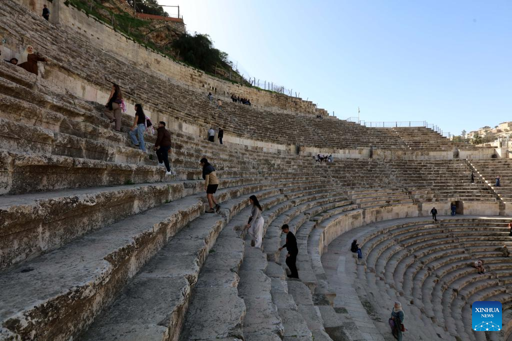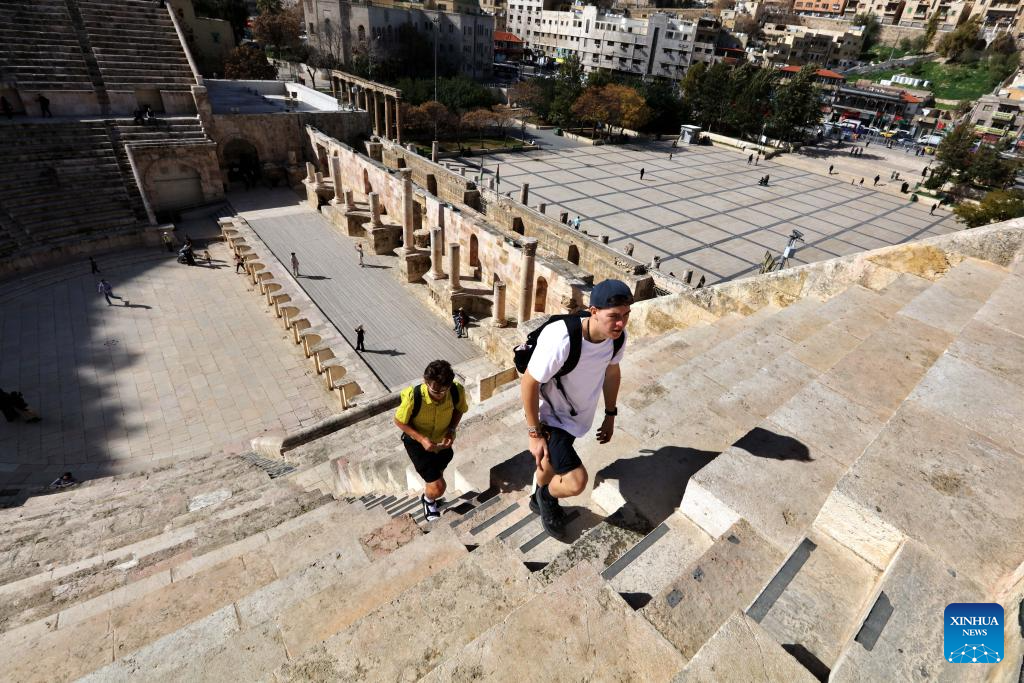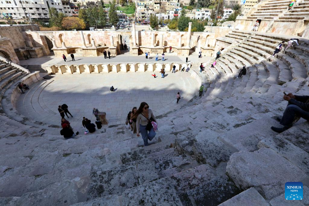 People visit the historical Roman Theater in Amman, Jordan, Feb. 2, 2026. (Photo by Mohammad Abu Ghosh/Xinhua)