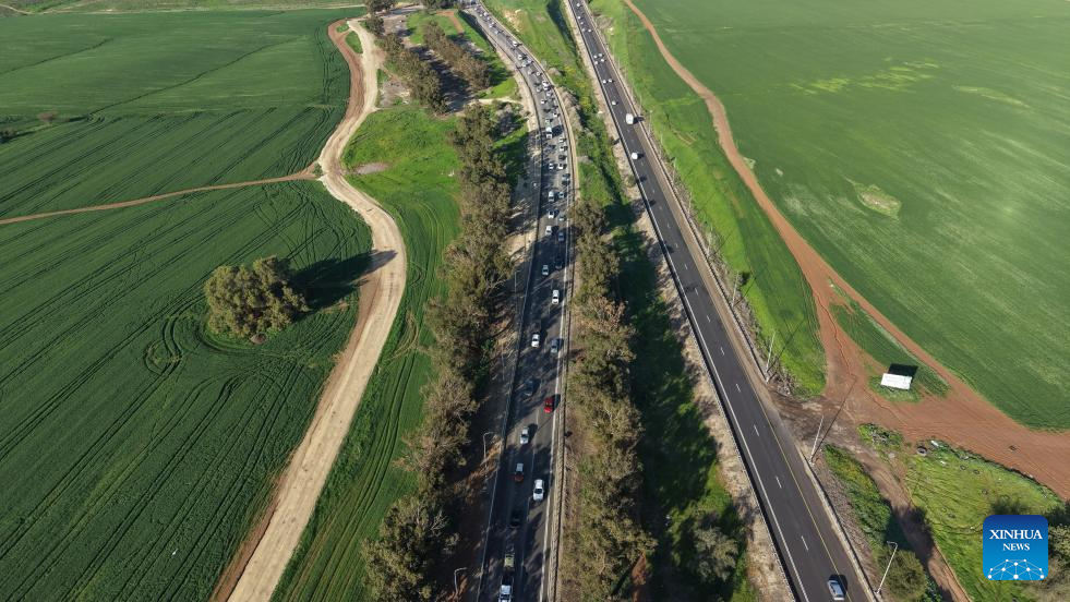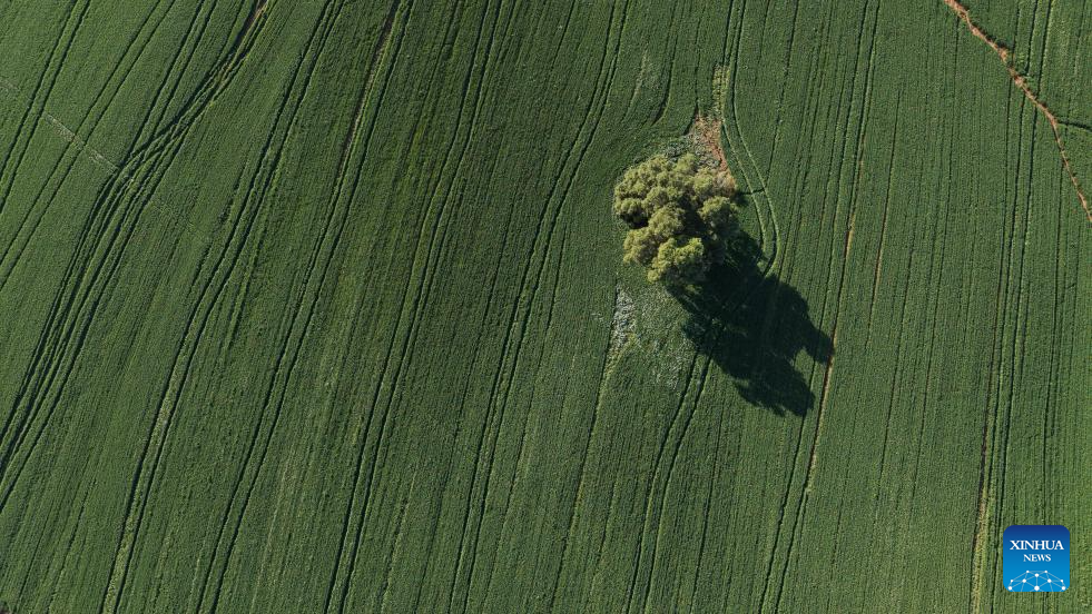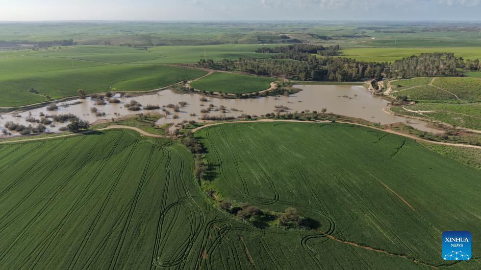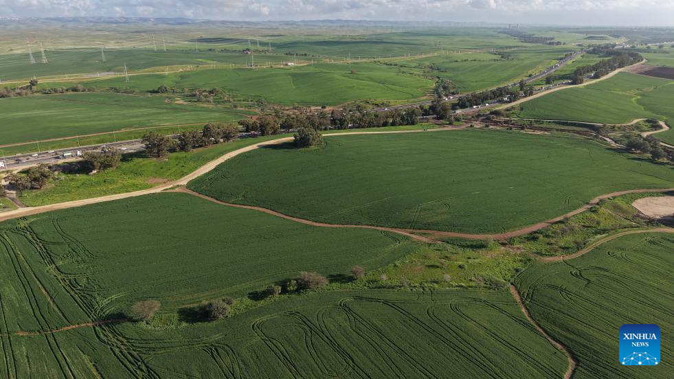 This aerial drone photo taken on Feb. 3, 2026 shows the green scenery of the Negev Desert near Kiryat Gat, southern Israel. (Photo by Gil Cohen Magen/Xinhua)