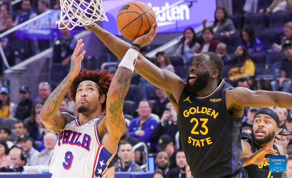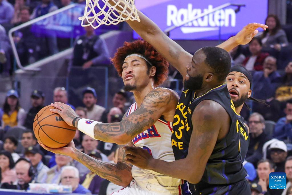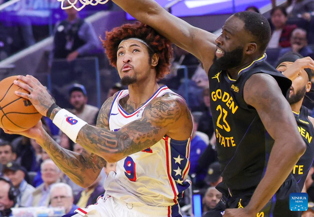 Kelly Oubre Jr. (L) of Philadelphia 76ers competes during the 2025-2026 NBA regular season basketball game between Golden State Warriors and Philadelphia 76ers in San Francisco, the United States, Feb. 3, 2026. (Photo by Arthur Dong/Xinhua)