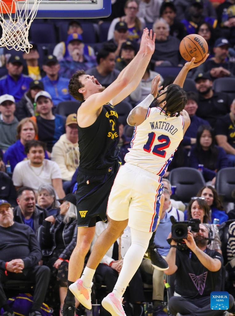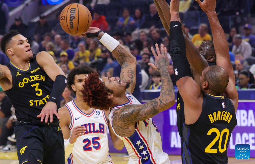 Kelly Oubre Jr. (2nd R) of Philadelphia 76ers competes during the 2025-2026 NBA regular season basketball game between Golden State Warriors and Philadelphia 76ers in San Francisco, the United States, Feb. 3, 2026. (Photo by Arthur Dong/Xinhua)