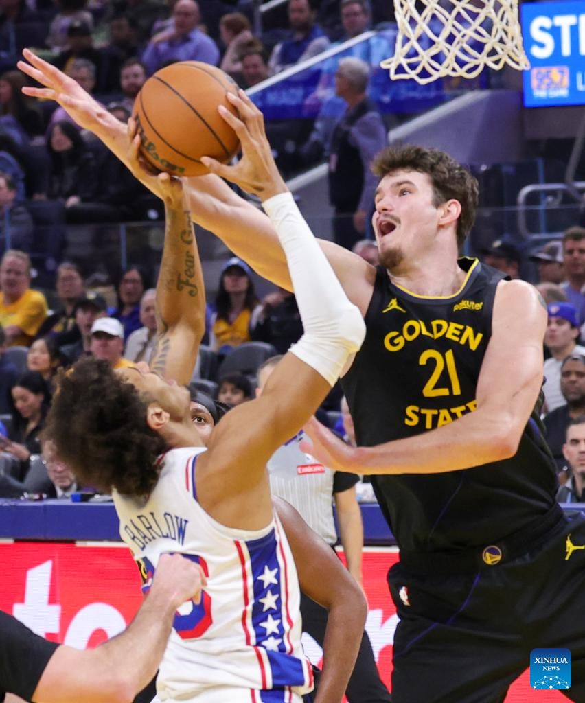 Quinten Post (R) of Golden State Warriors defends Dominick Barlow of Philadelphia 76ers during the 2025-2026 NBA regular season basketball game between Golden State Warriors and Philadelphia 76ers in San Francisco, the United States, Feb. 3, 2026. (Photo by Arthur Dong/Xinhua)
