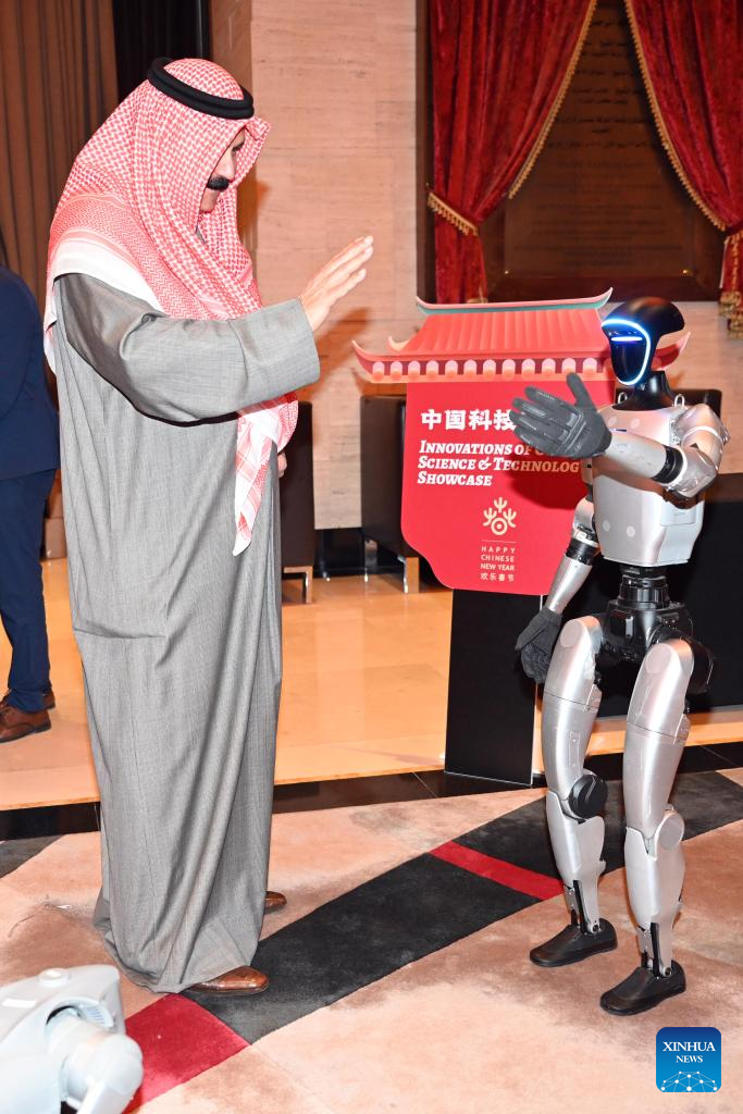A man interacts with a robot during the "Happy Chinese New Year" celebrations in Farwaniya Governorate, Kuwait, Feb. 3, 2026. (Photo by Asad/Xinhua)