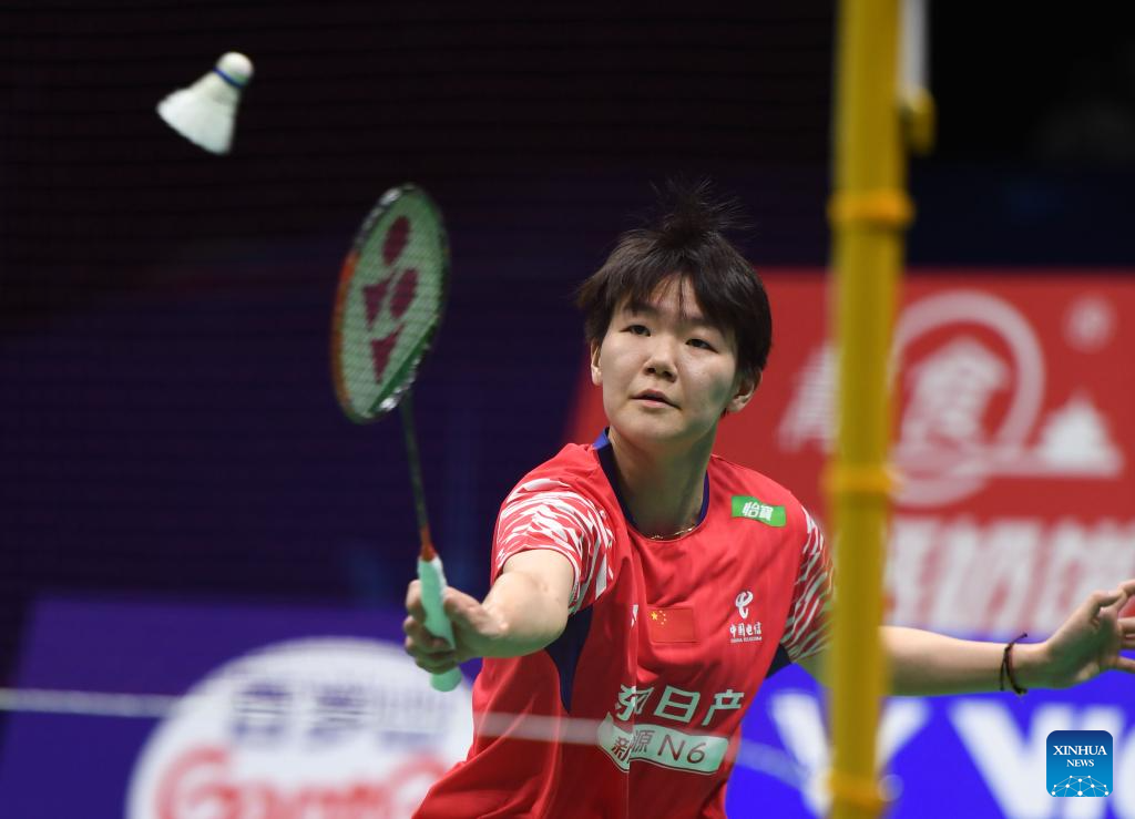 Yuan Anqi of China hits a return in the women's singles match against Oo Shan Zi of Malaysia during the women's team Group W match between China and Malaysia at Badminton Asia Team Championships 2026 in Qingdao, east China's Shandong Province, Feb. 4, 2026. (Xinhua/Li Ziheng)