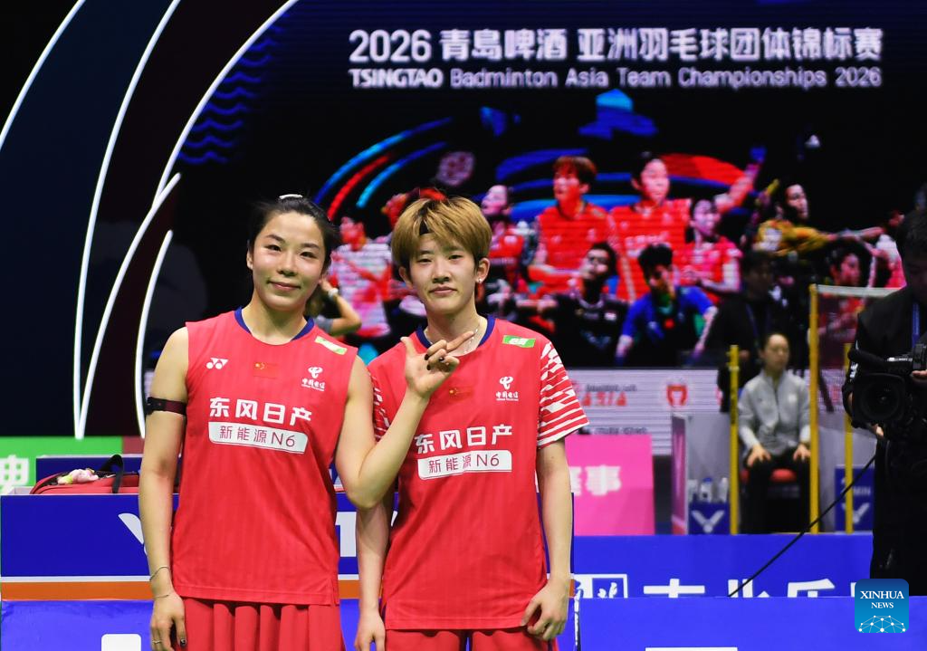 Jia Yifan (L)/Zhang Shuxian of China celebrate after winning the women's doubles match against Ong Xin Yee/Carmen Ting of Malaysia during the women's team Group W match between China and Malaysia at Badminton Asia Team Championships 2026 in Qingdao, east China's Shandong Province, Feb. 4, 2026. (Xinhua/Li Ziheng)