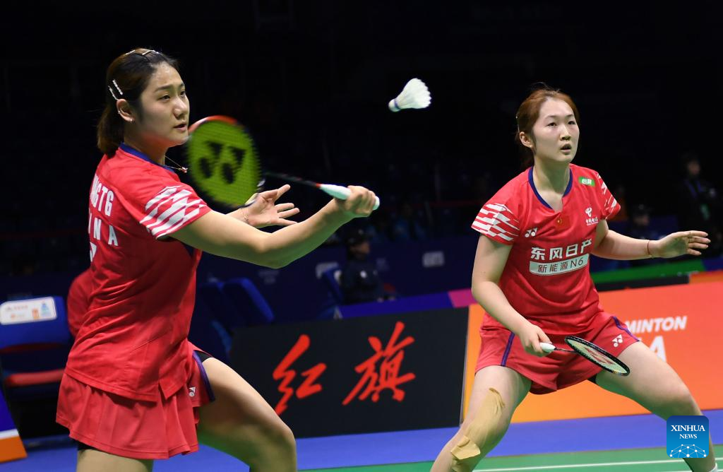 Luo Yi/Wang Tingge (L) of China compete in the women's doubles match against Zi Yu Low/Noraqilah Maisarah of Malaysia during the women's team Group W match between China and Malaysia at Badminton Asia Team Championships 2026 in Qingdao, east China's Shandong Province, Feb. 4, 2026. (Xinhua/Li Ziheng)