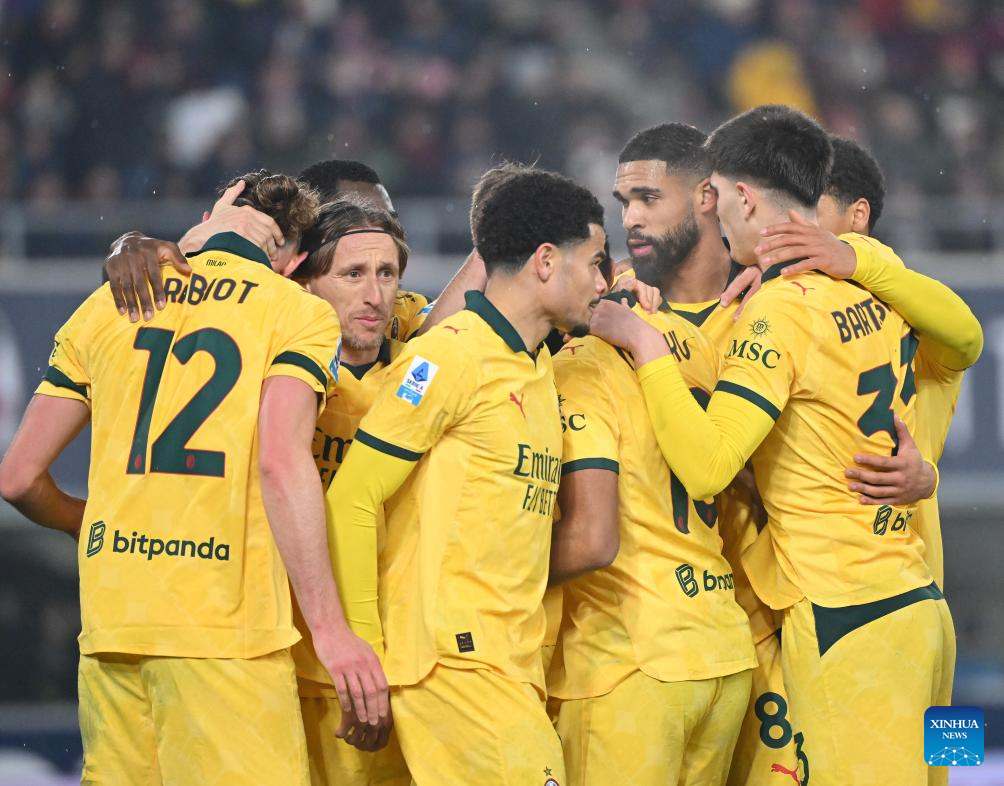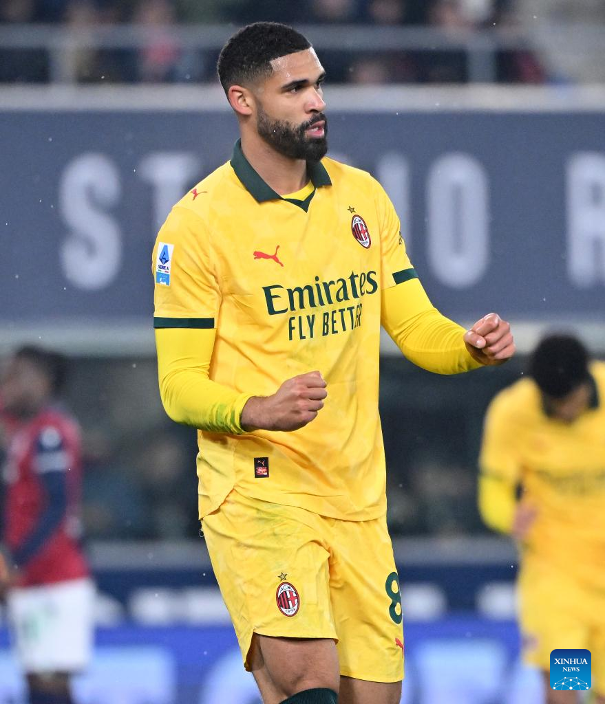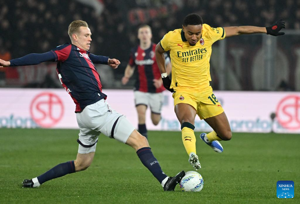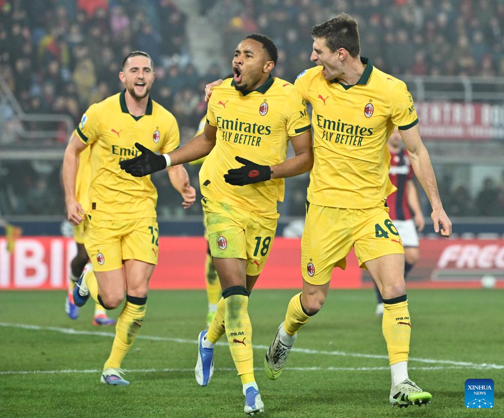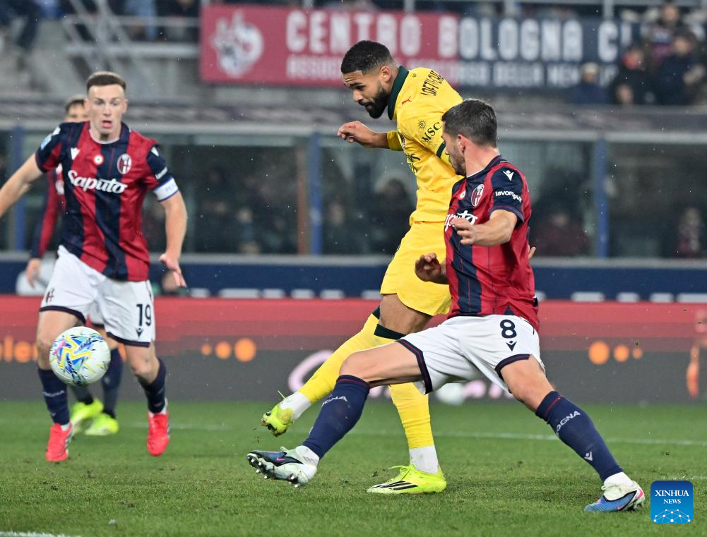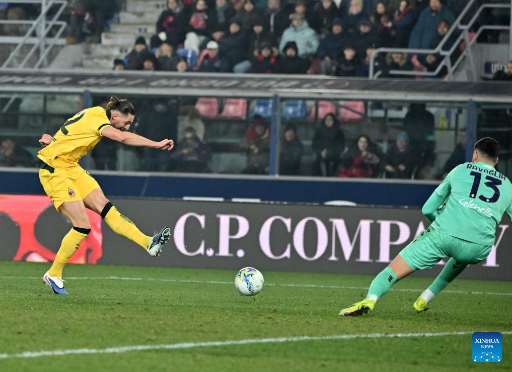 AC Milan's Ruben Loftus-Cheek (2nd R) scores during a Serie A football match between Bologna and AC Milan in Bologna, Italy, Feb. 3, 2026. (Photo by Alberto Lingria/Xinhua)